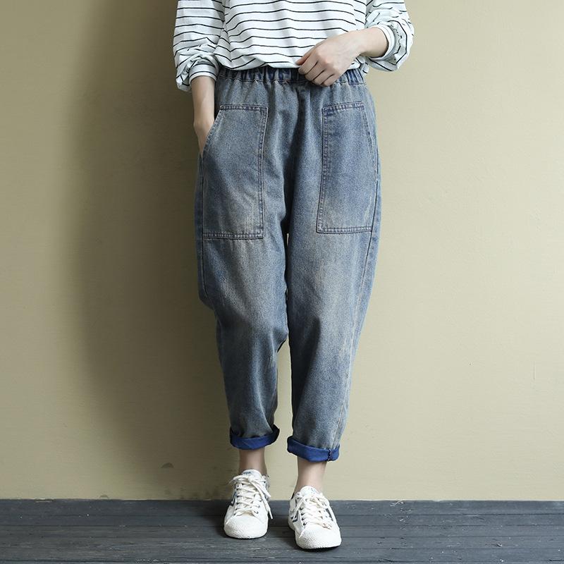 Buykud Classic Solid Color Large Pocket Harem Jeans