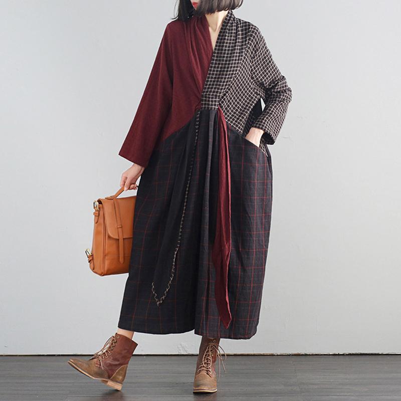 Buykud Cross Splicing Plaid Lacing Retro Casual Dress
