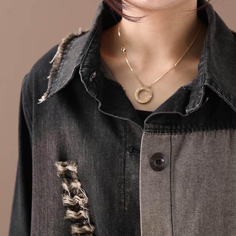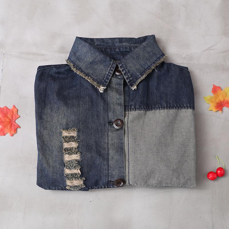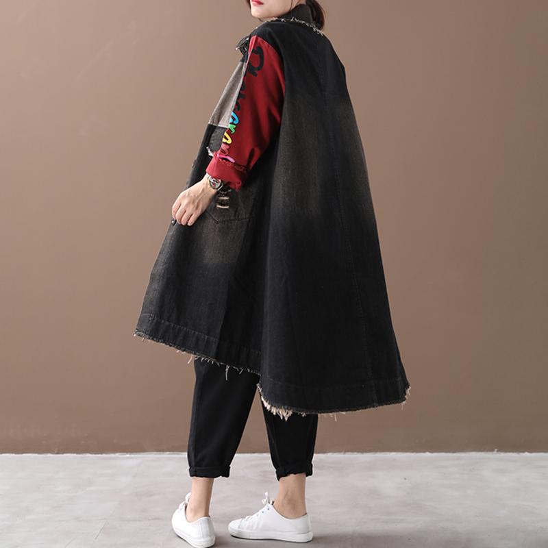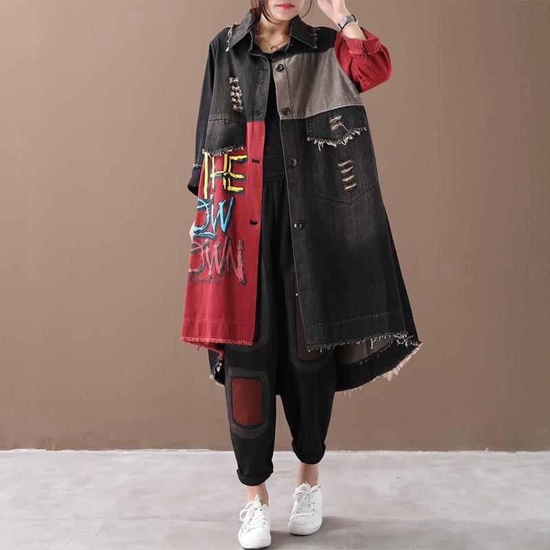 Buykud Letter Printed Hole Burr Casual Denim Dress