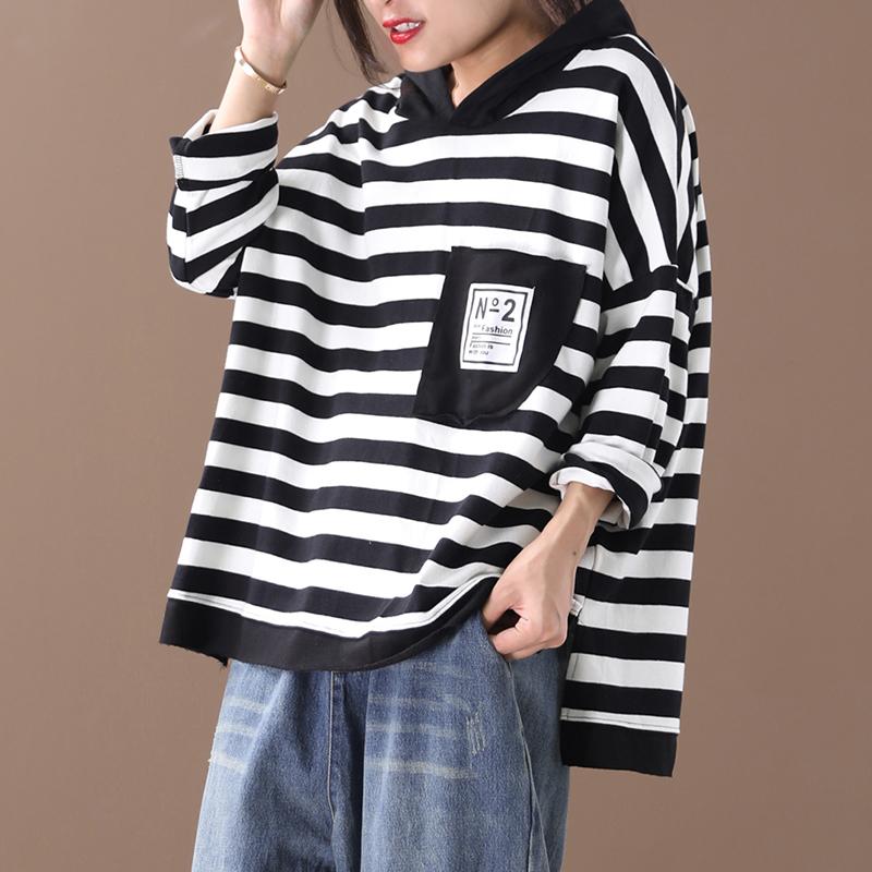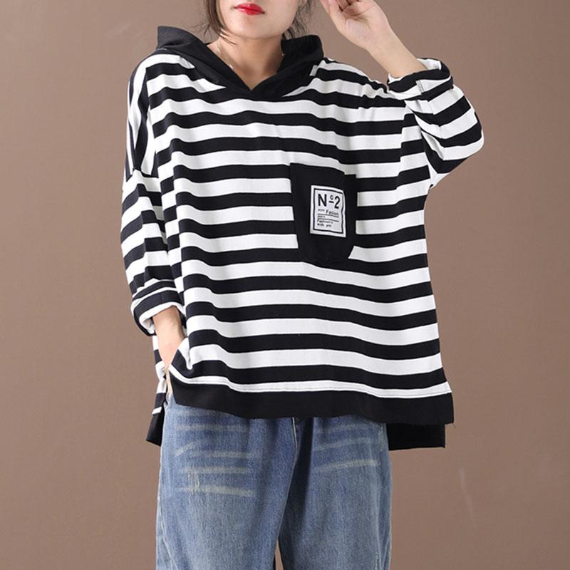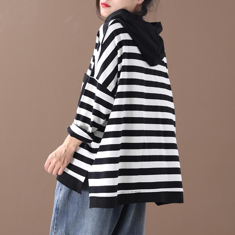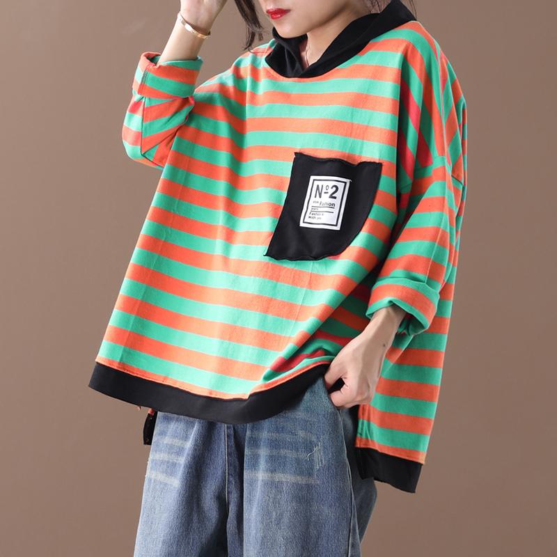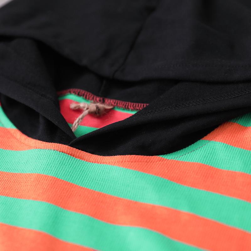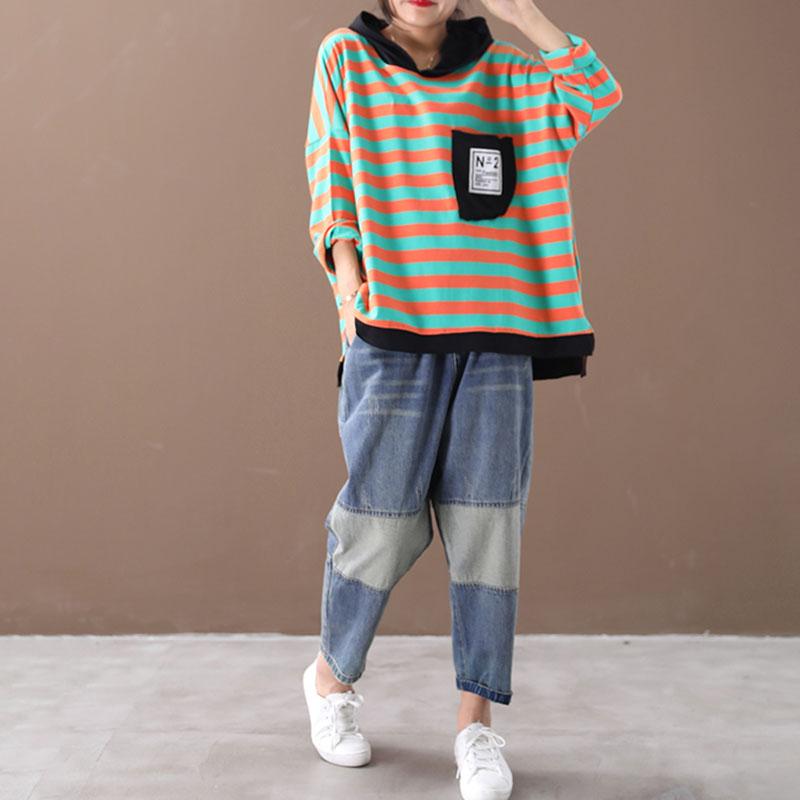 Buykud Loose Literary Patchwork Striped Pullover Hoodie
