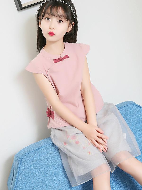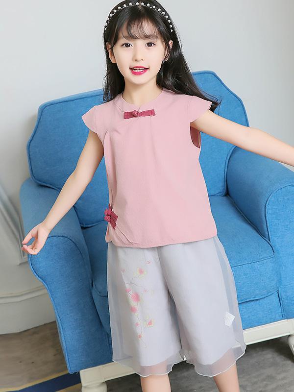 Casual Chinese Style Cotton Little Girl Suit Pants and T-shirt