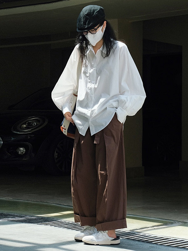 Casual Loose Puff Sleeves Solid Color Lapel Blouses