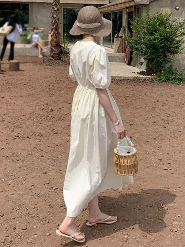 Casual Loose Solid Color Pleated Drawstring Square-Neck Bishop Sleeves Midi Dress
