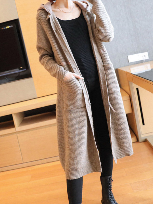 Casual Loose Solid Color Split-Joint With Pocket Buttoned Drawstring Hooded Long Sleeves Knitted Cardigan Outwear