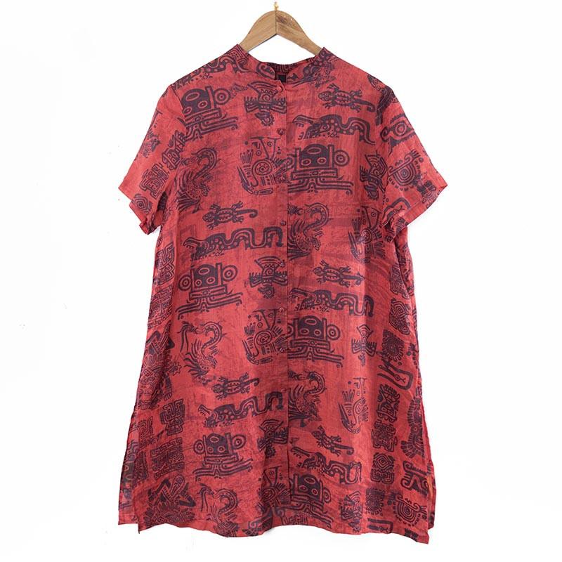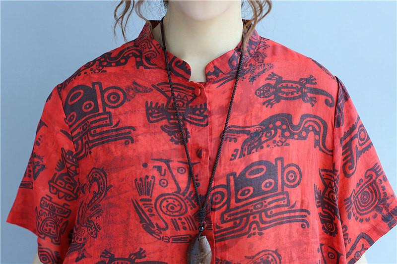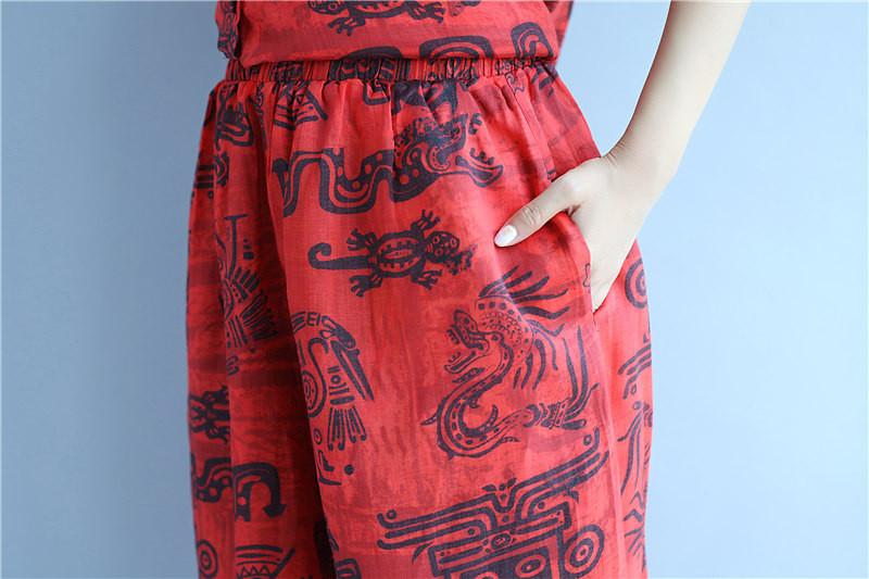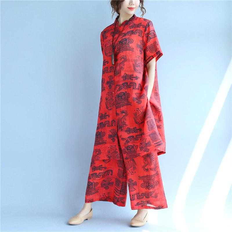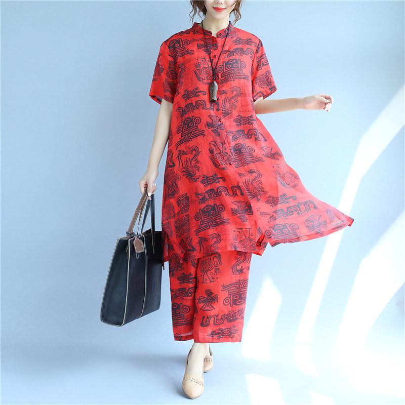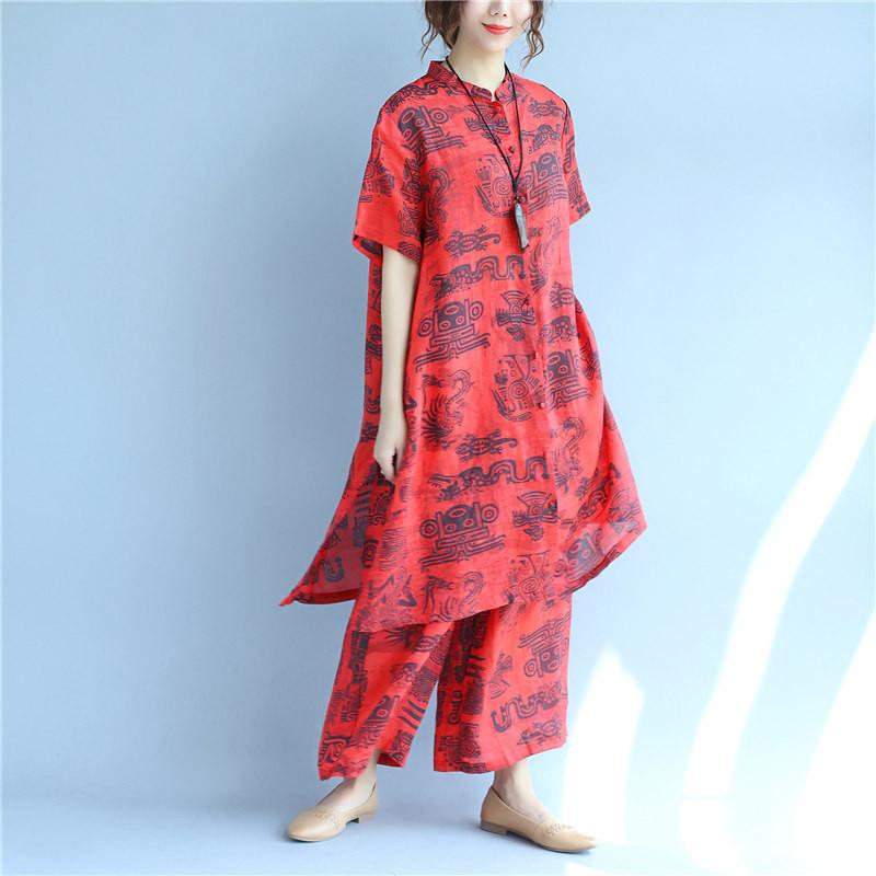 Casual Print Linen Women Red Suits(Shirt+Pants)