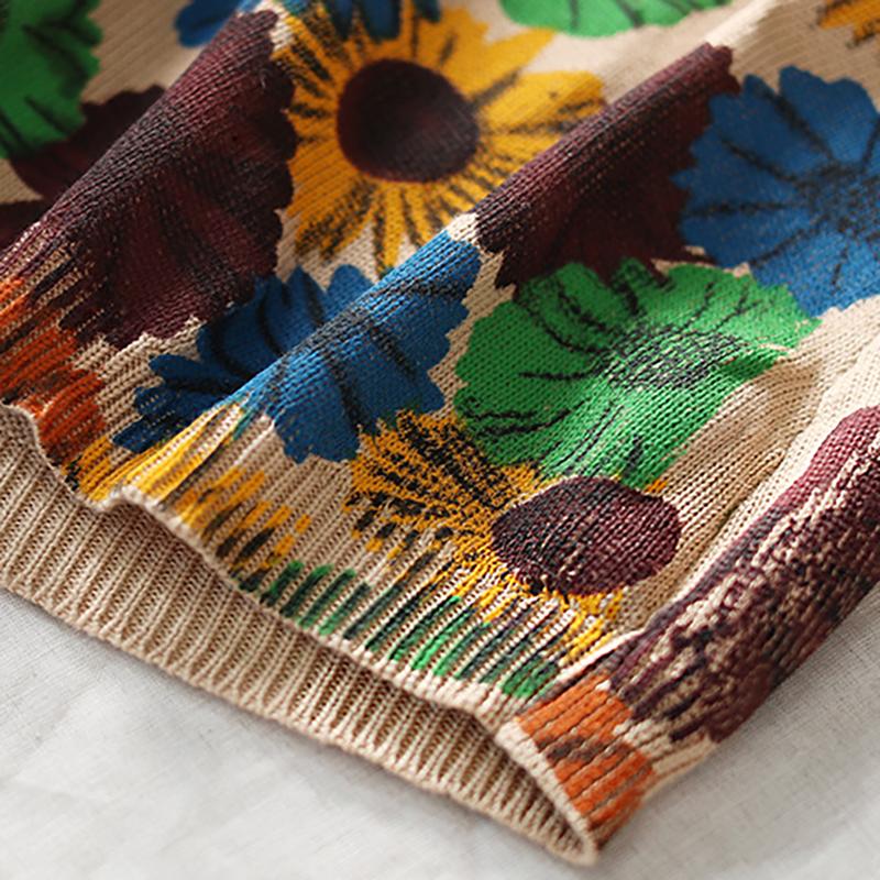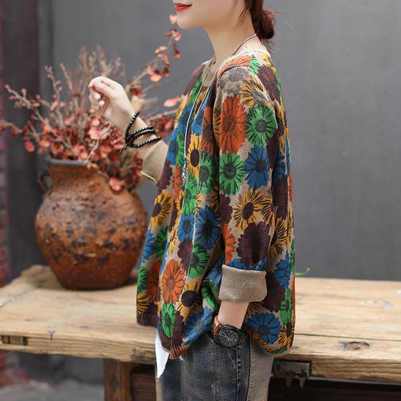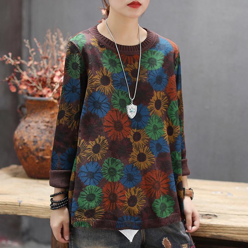 Casual Retro Floral Printed O-neck Knitted Shirt