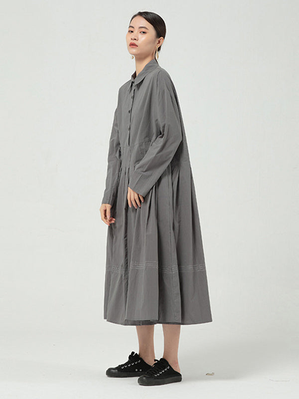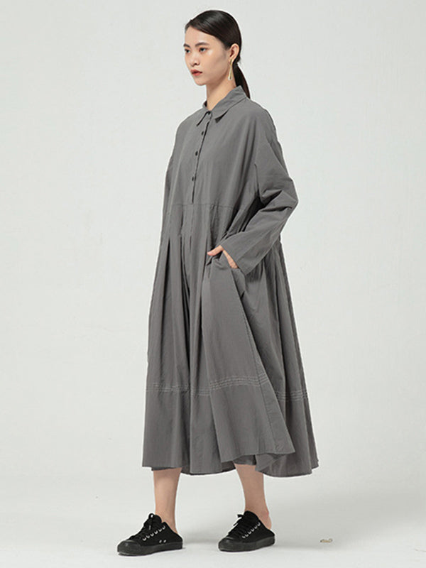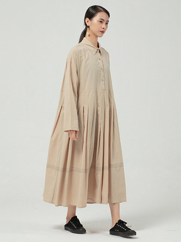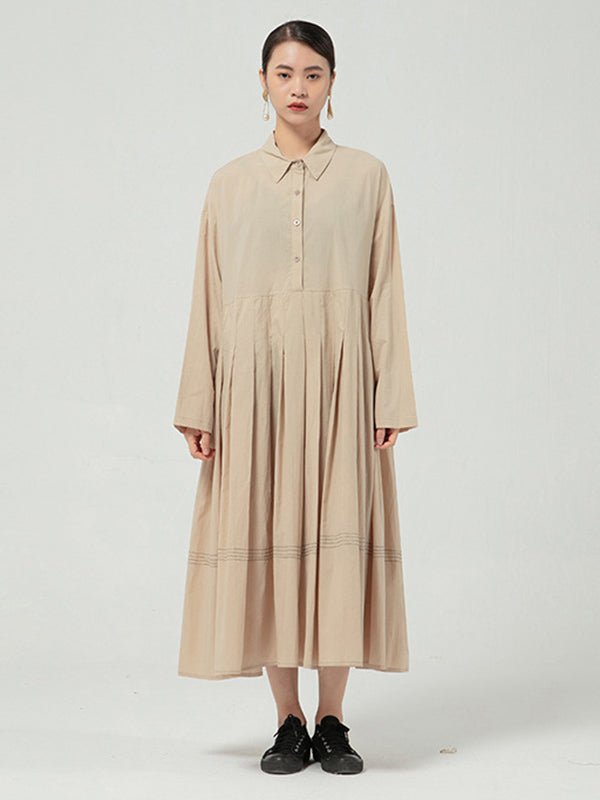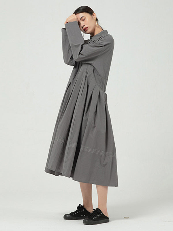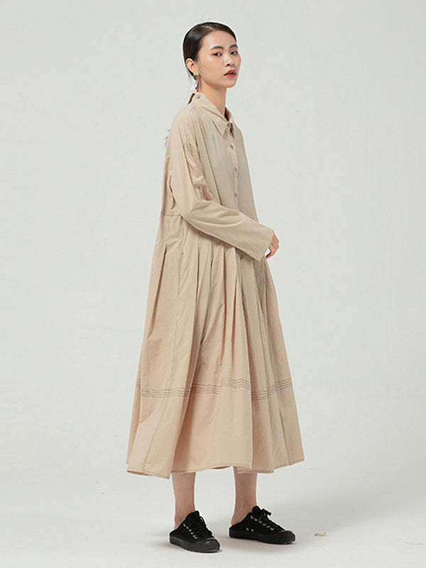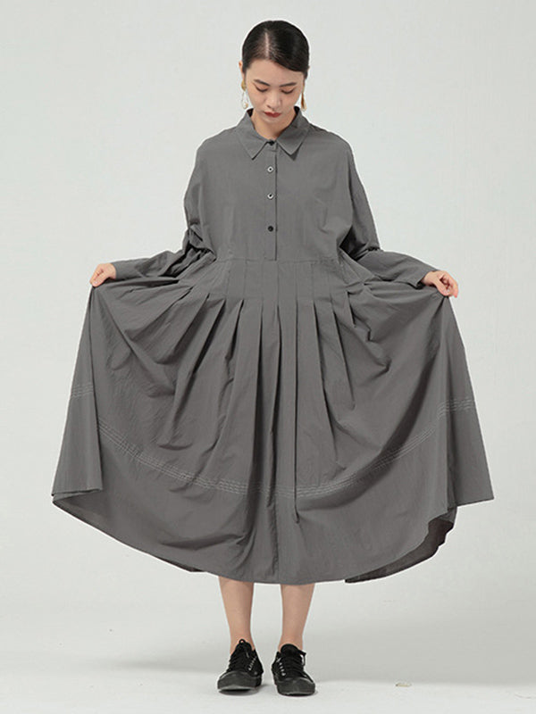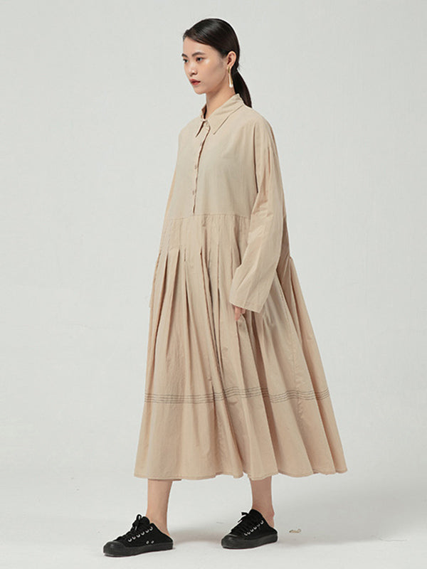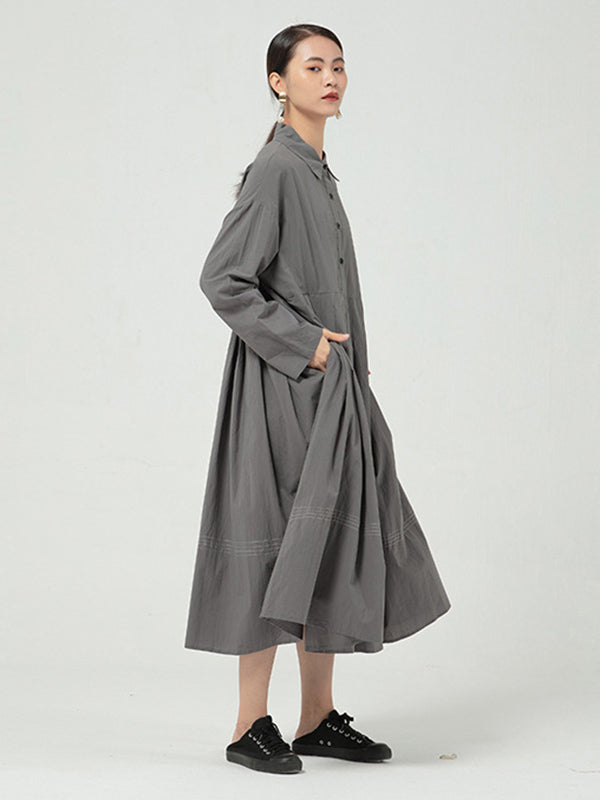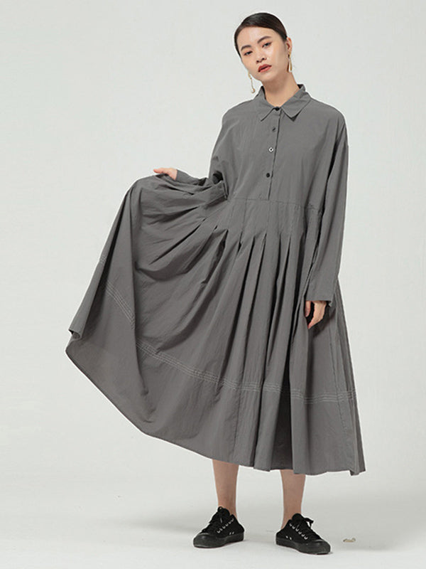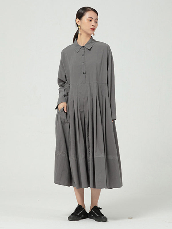 Casual Solid Color Buttoned Pleated Lapel Collar Long Sleeves Midi Dress