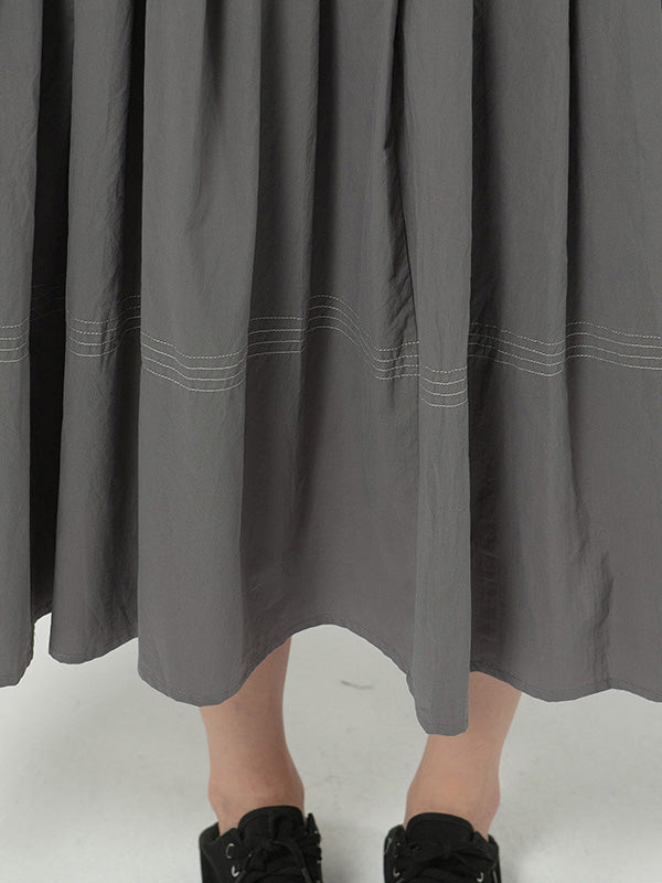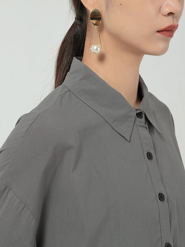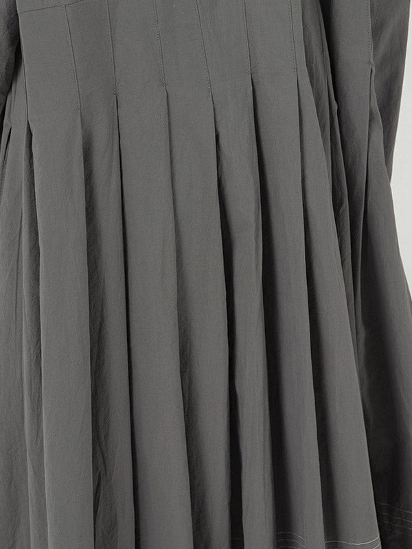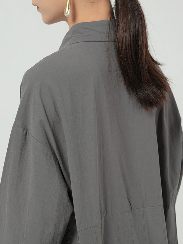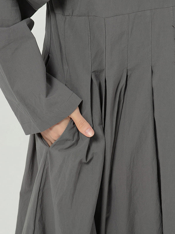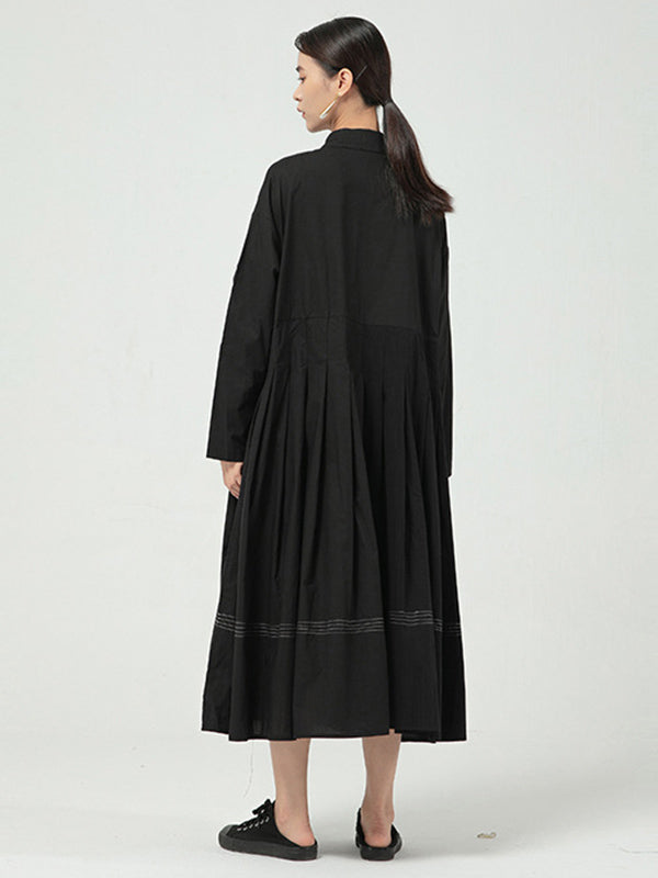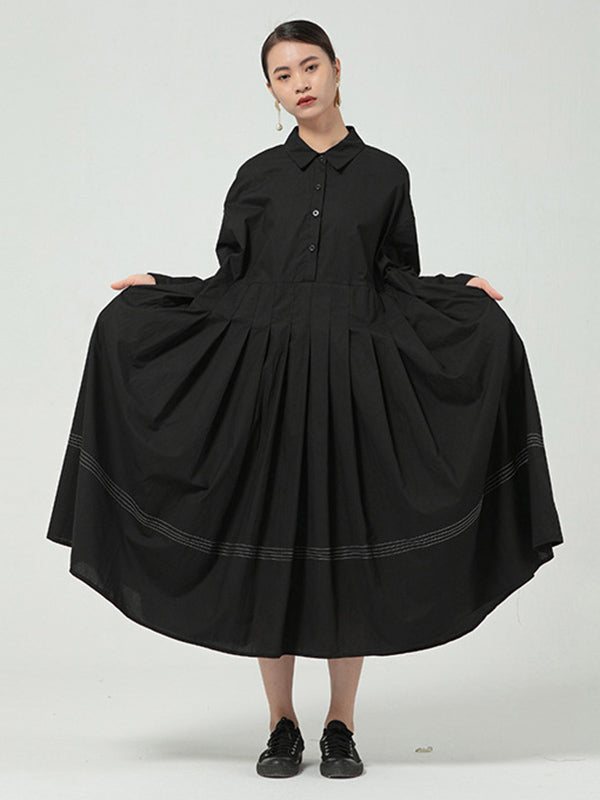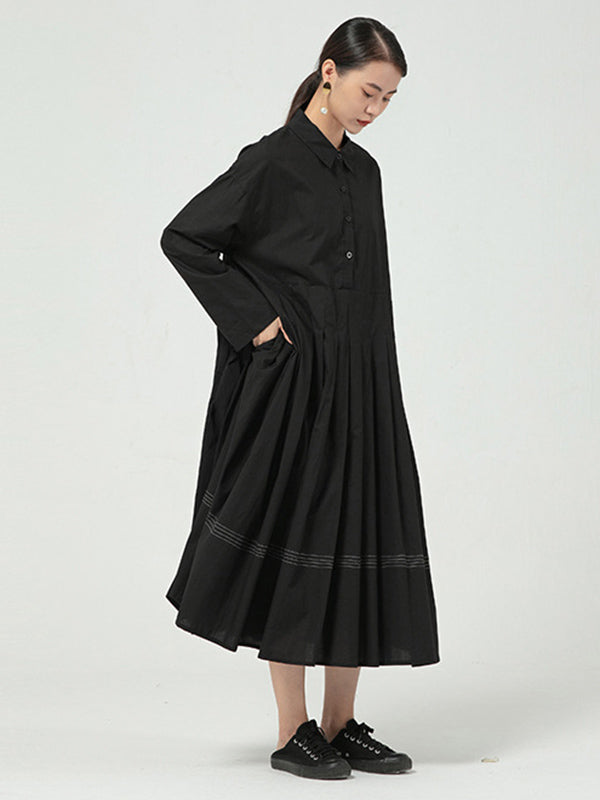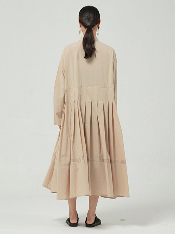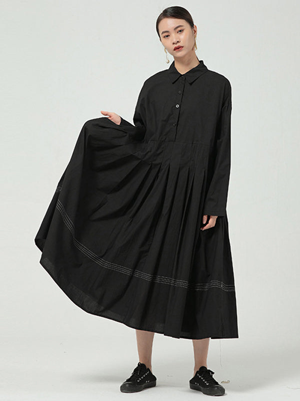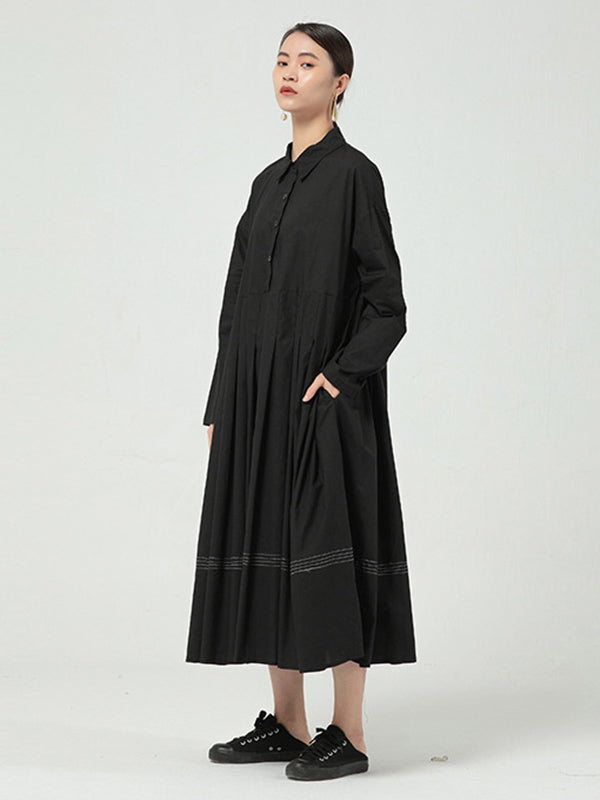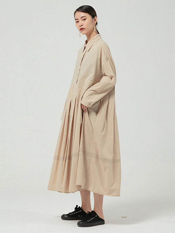 Casual Solid Color Buttoned Pleated Lapel Collar Long Sleeves Midi Dress