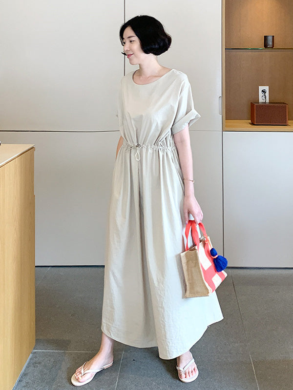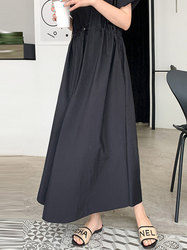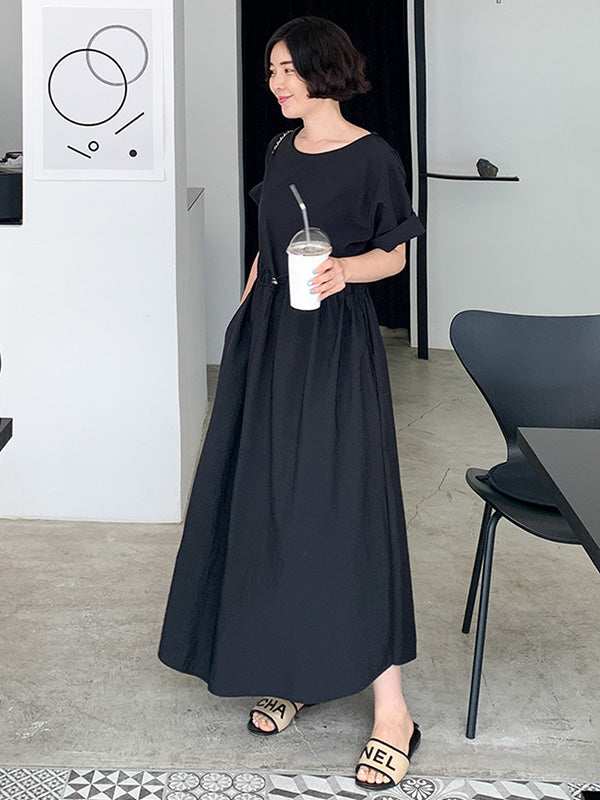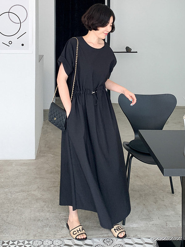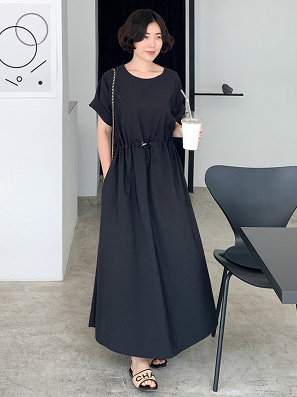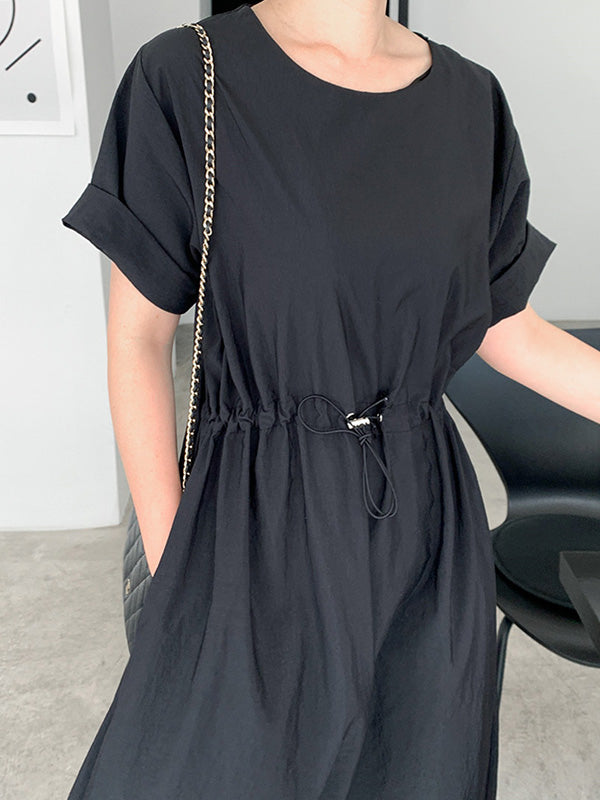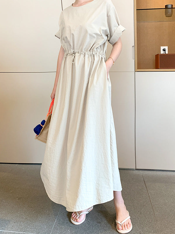 Casual Solid Color Drawstring Pleated Round-Neck Half Sleeves High-Waist Midi Dress