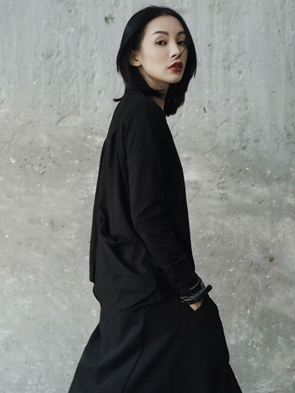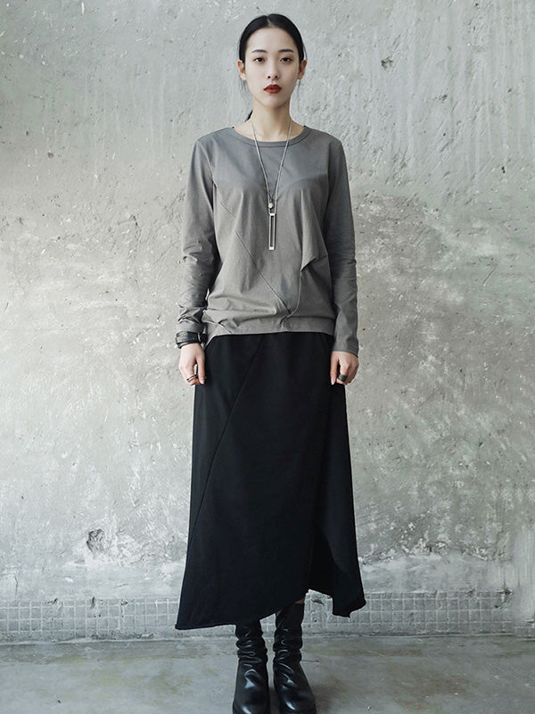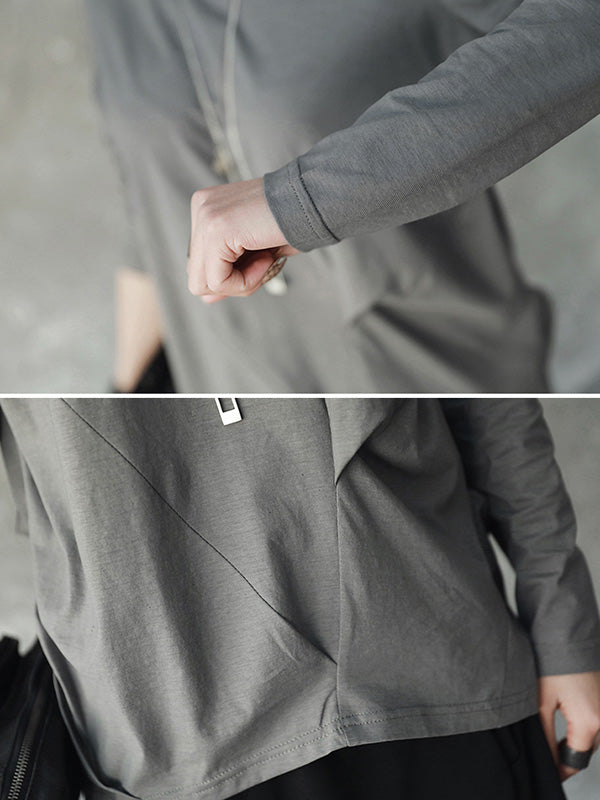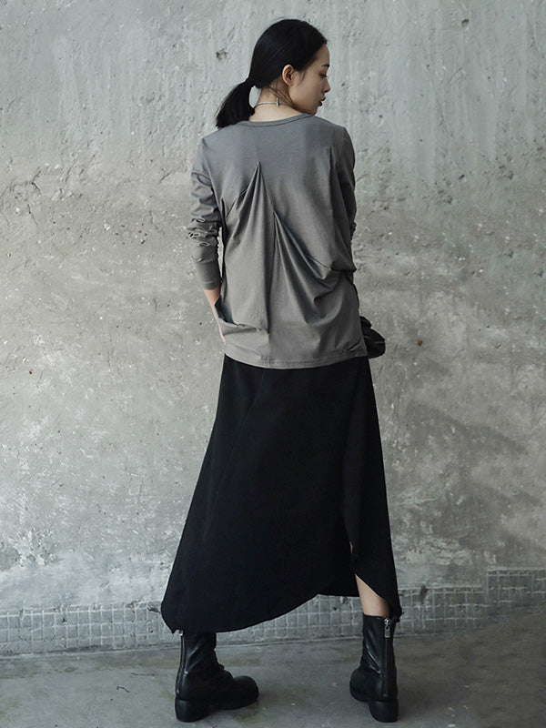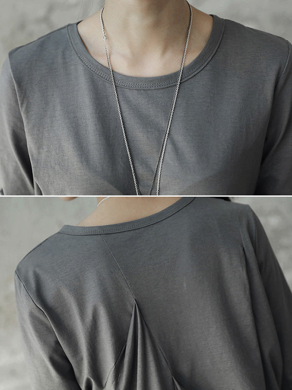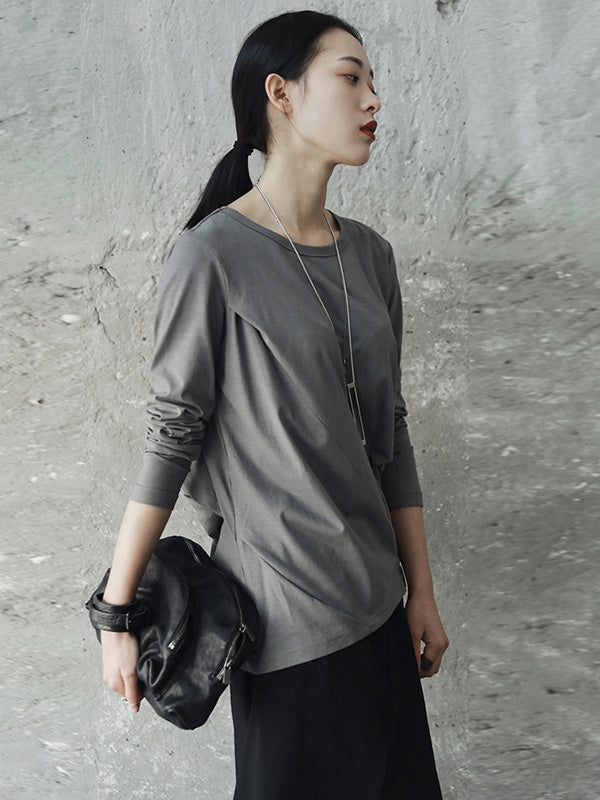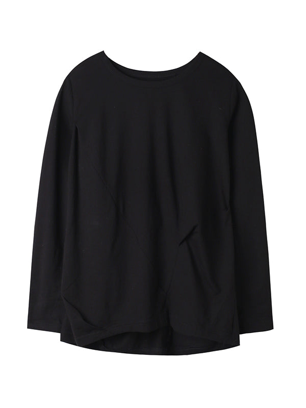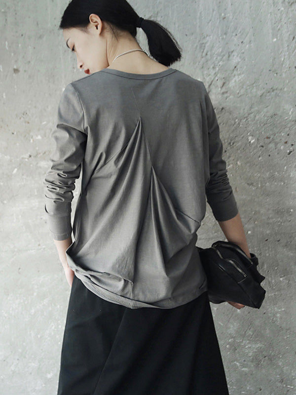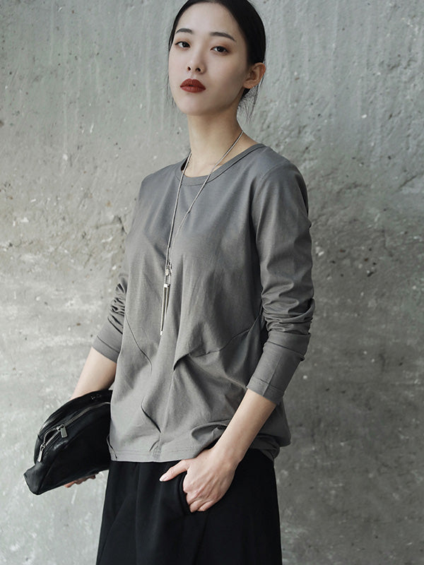 Casual Solid Color Pleated Long Sleeves Round-Neck T-Shirt Tops