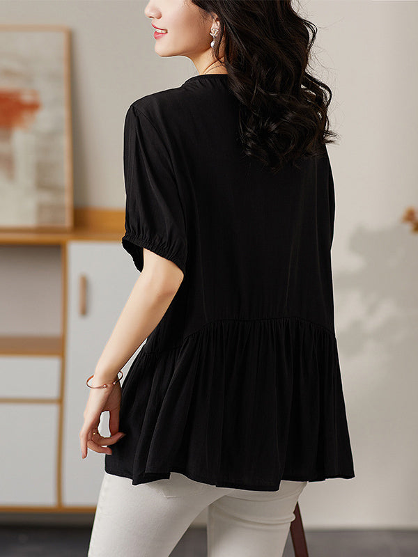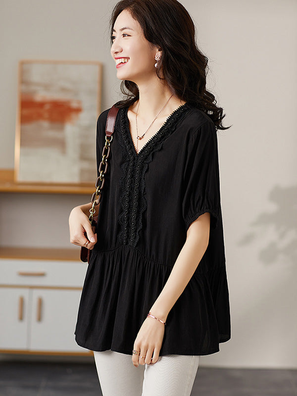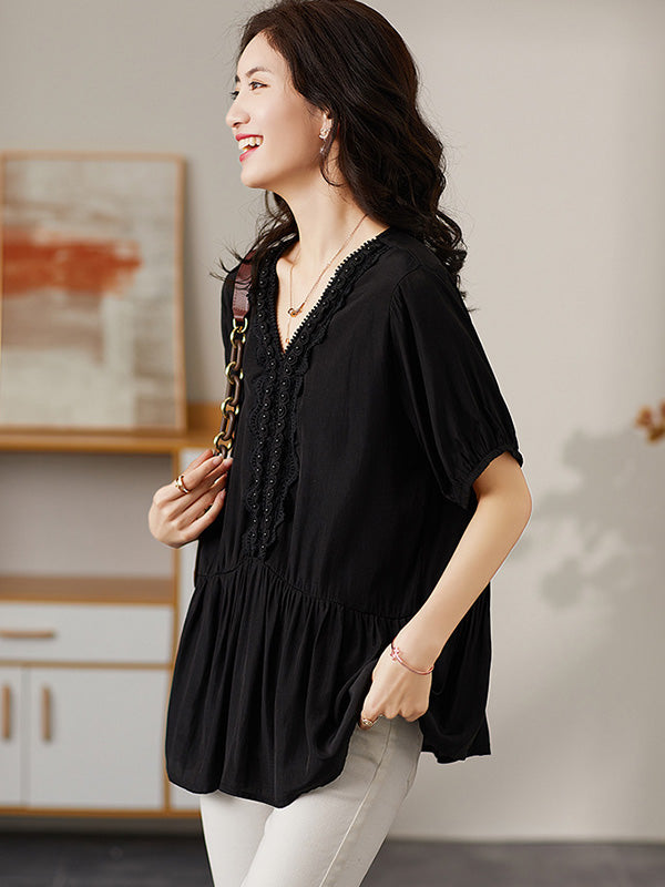 Casual Solid Color Split-Joint Lace Pleated Beaded V-Neck Elasticity Short Sleeves T-Shirt