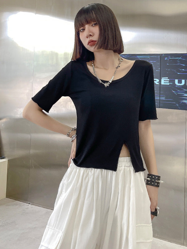 Casual Solid Color Split-Side Short Sleeves U-Neck Shirts