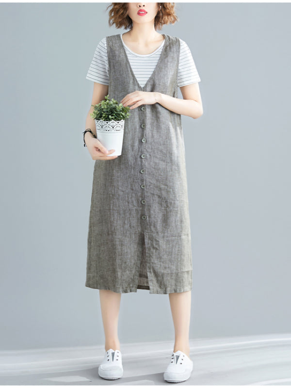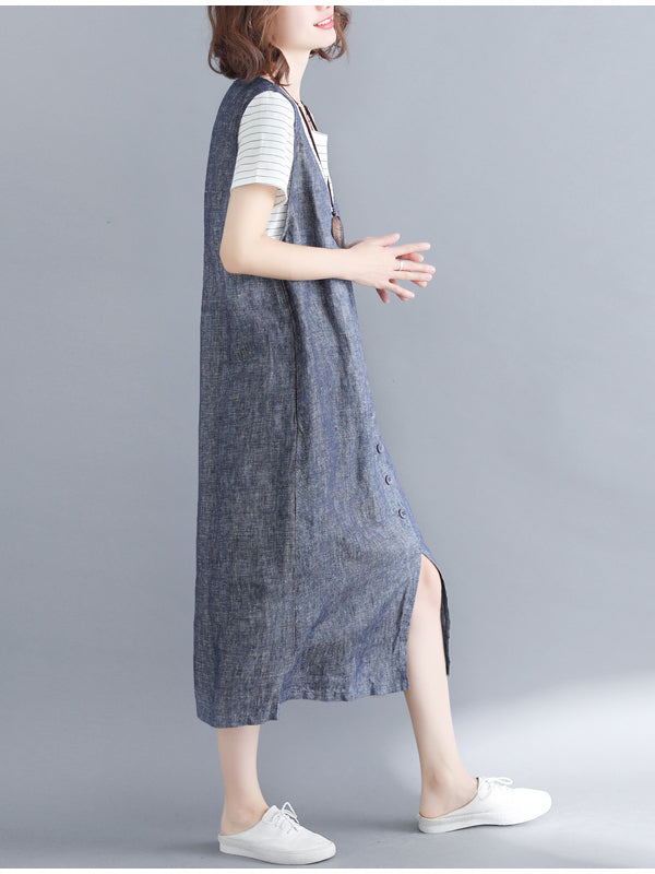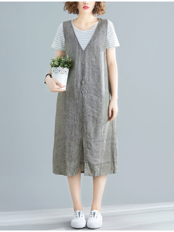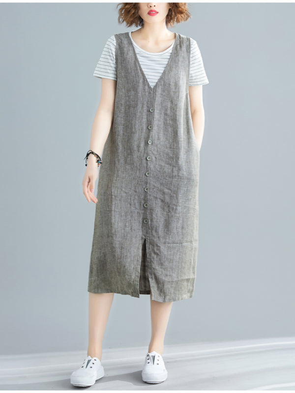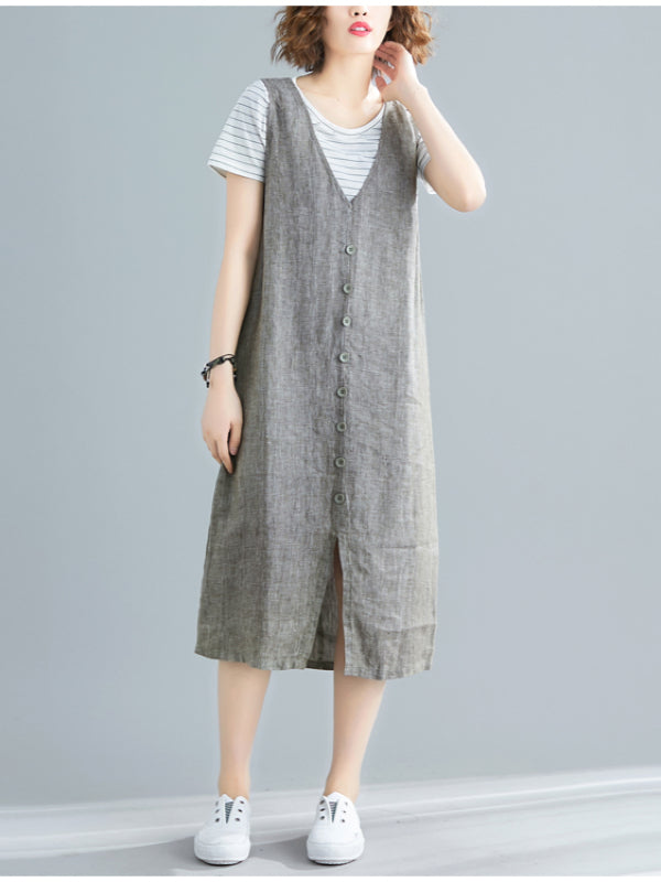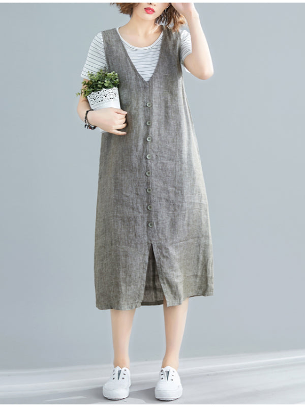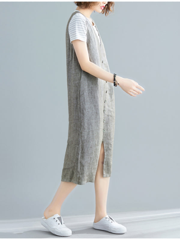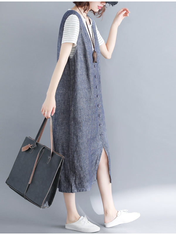 CASUAL SOLID SPLIT-FRONT WIDE STRAPS MIDI DRESS