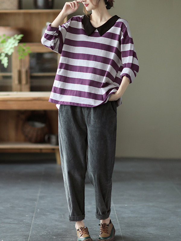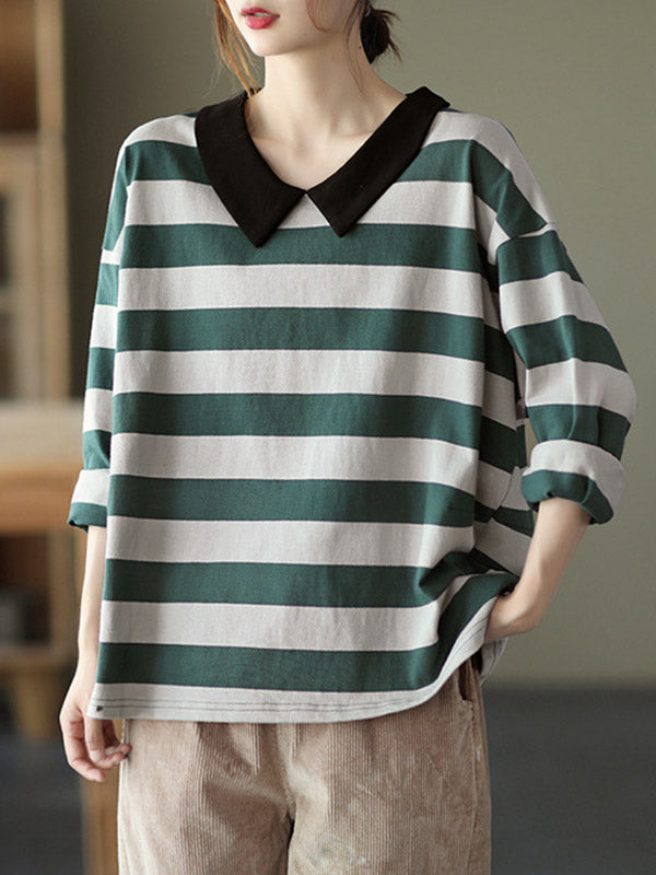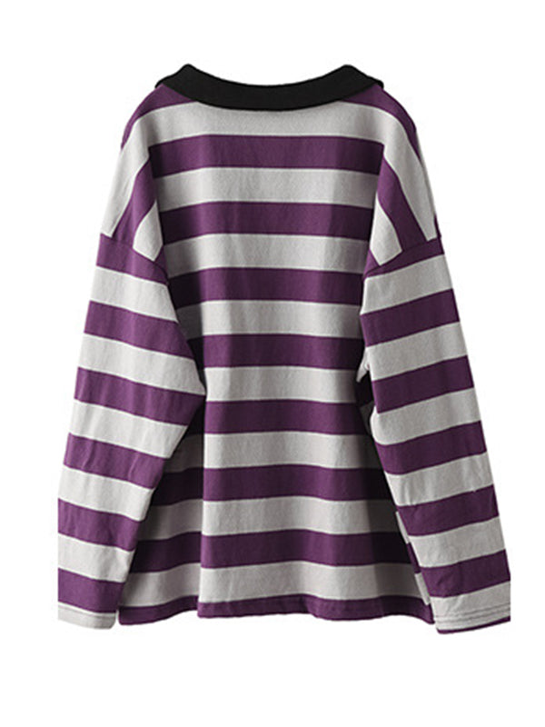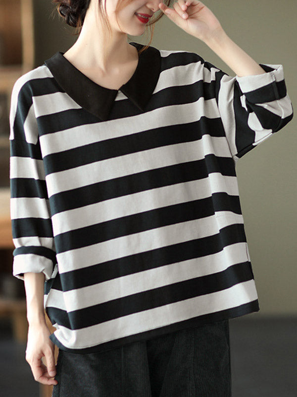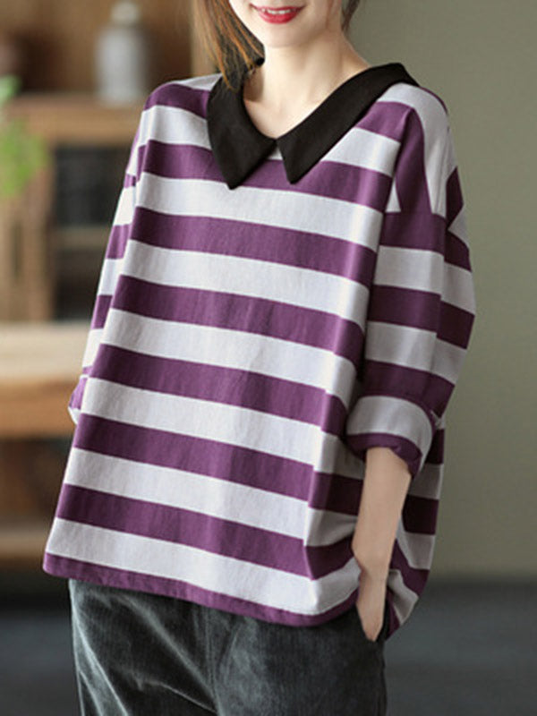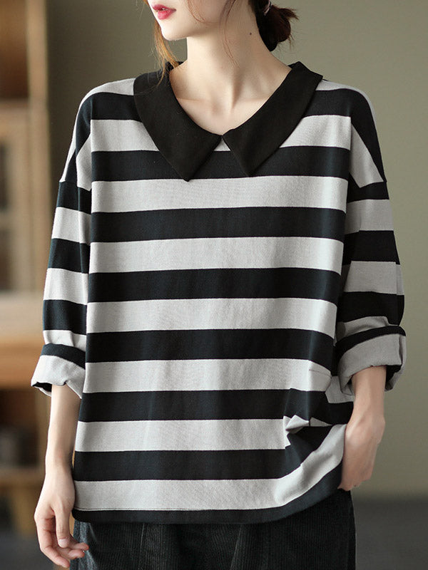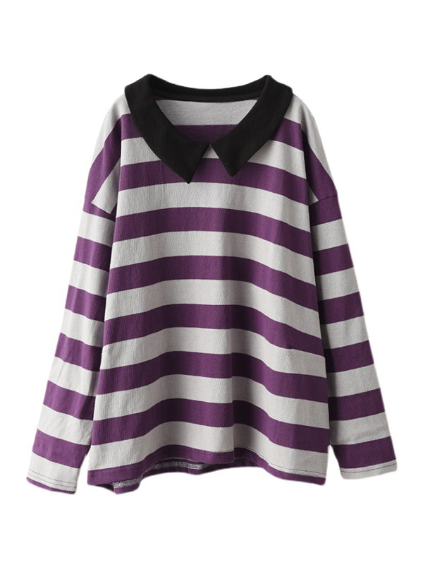 Casual Striped Contrast Color Long Sleeves Doll Collar Loose T-Shirt Tops