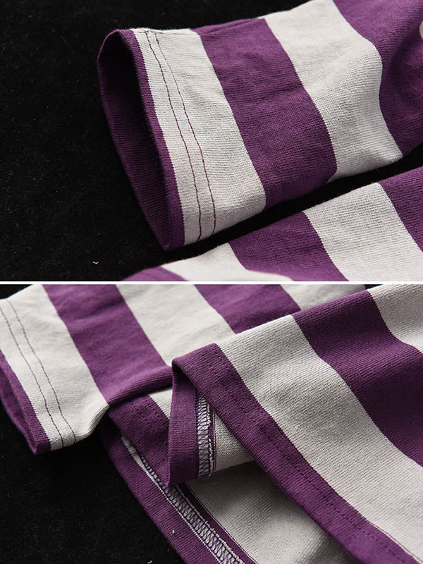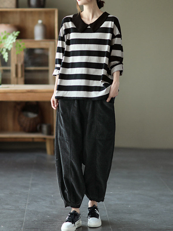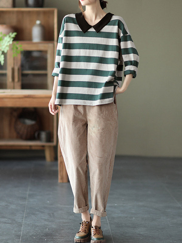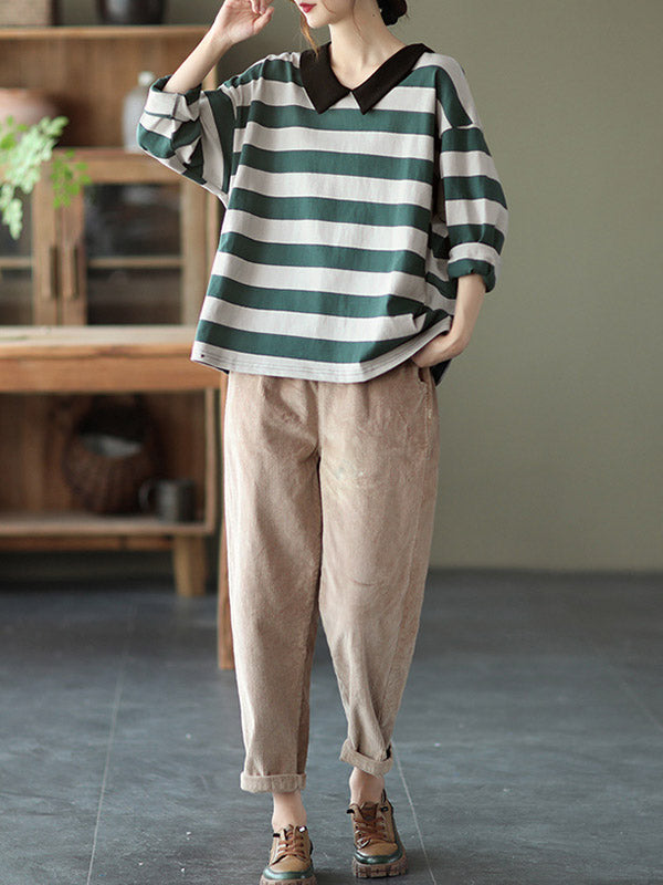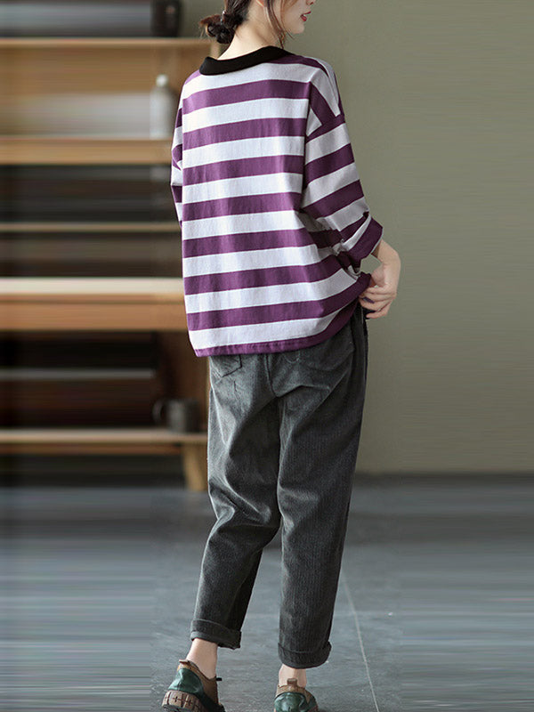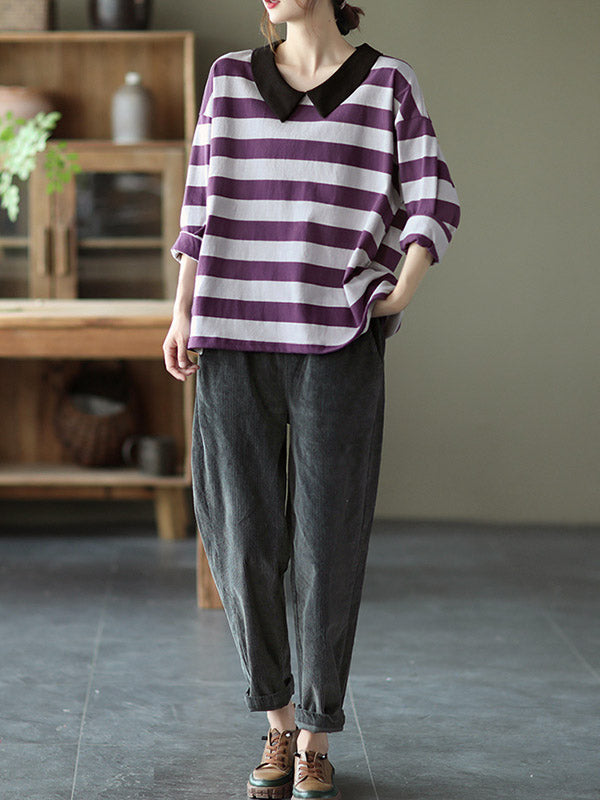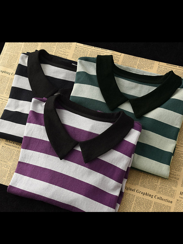 Casual Striped Contrast Color Long Sleeves Doll Collar Loose T-Shirt Tops