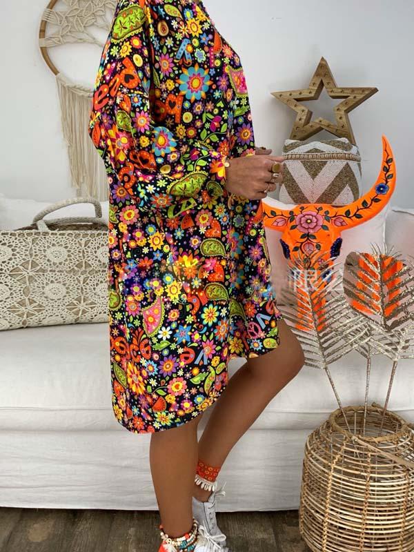 Casual V-neck Printed Puff Sleeve Mini Dress