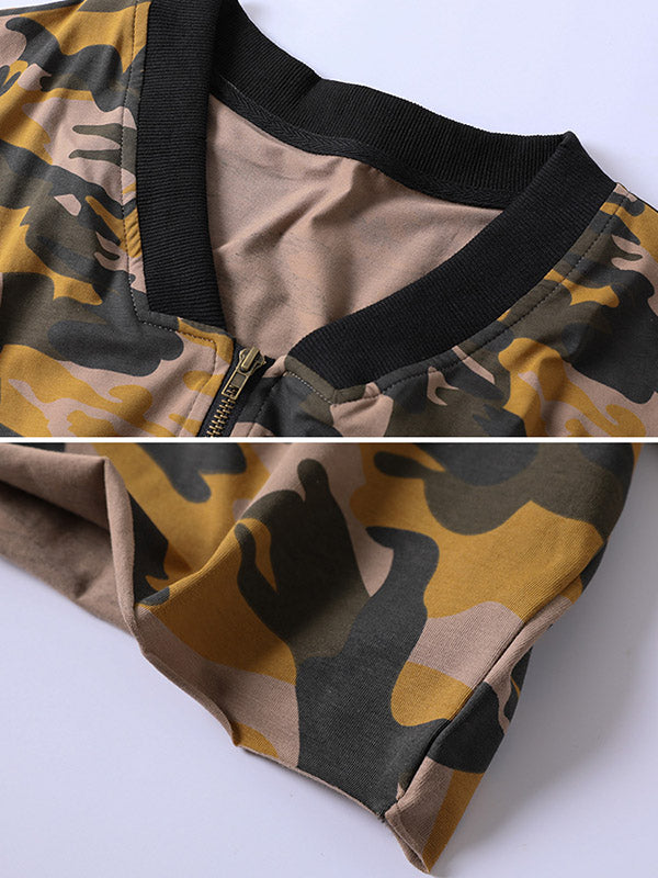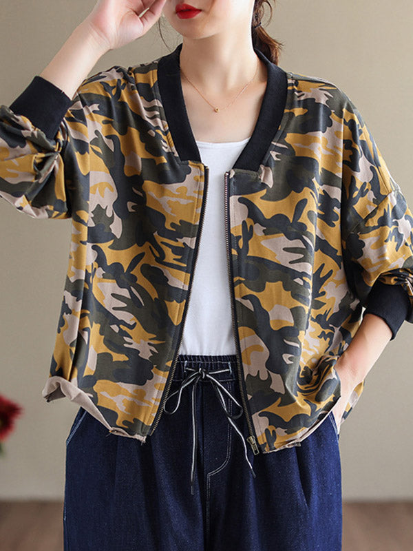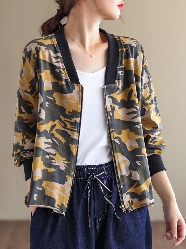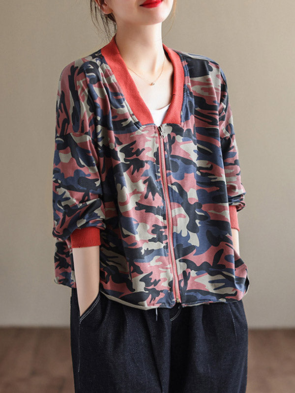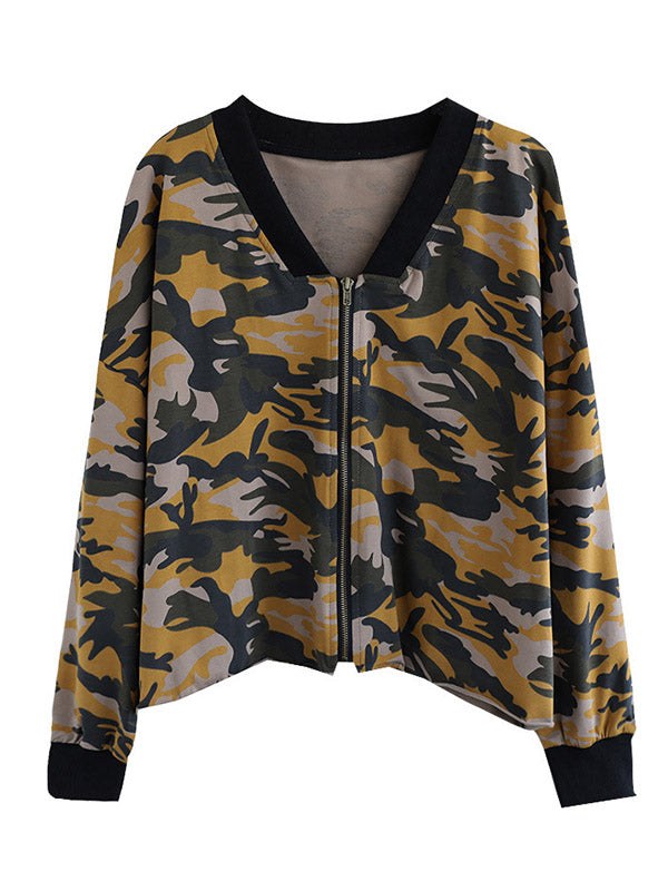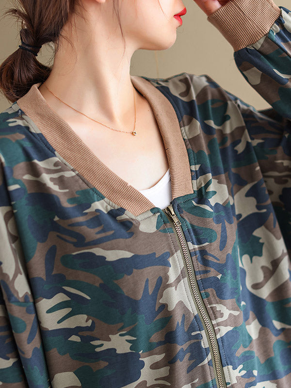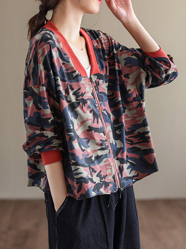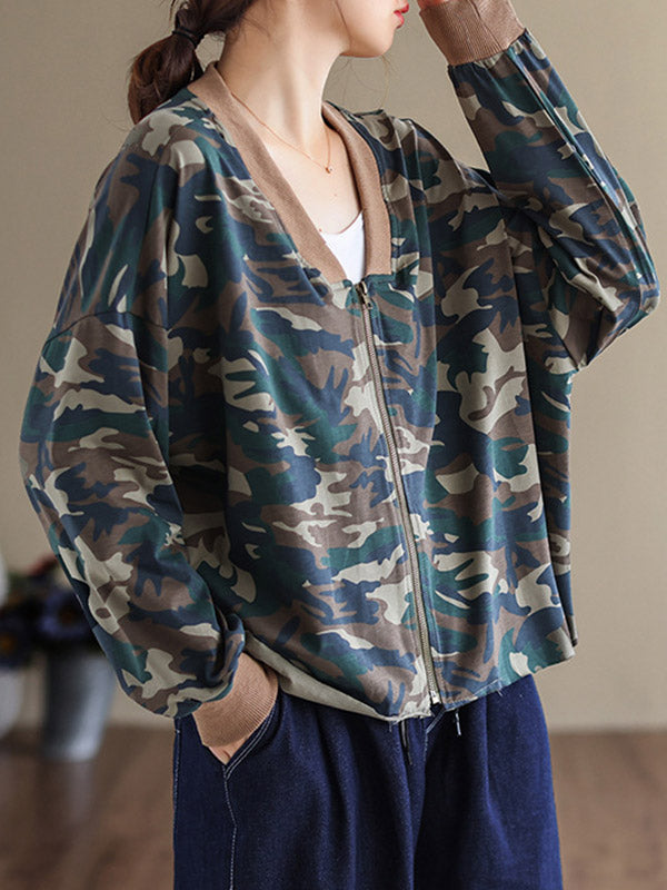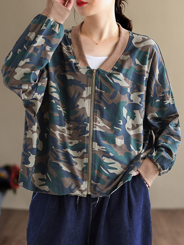 Casual Zipper V-Neck Camouflage Printed Long Sleeves Outerwear