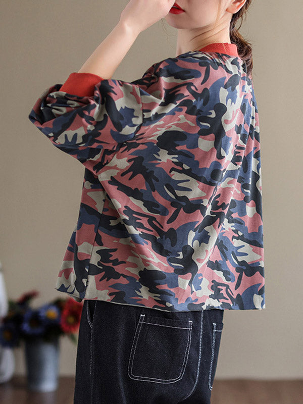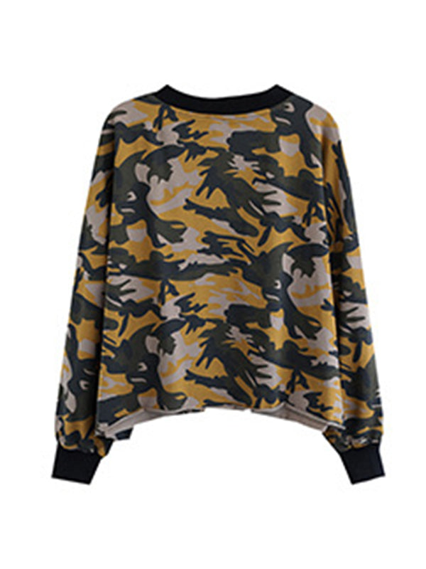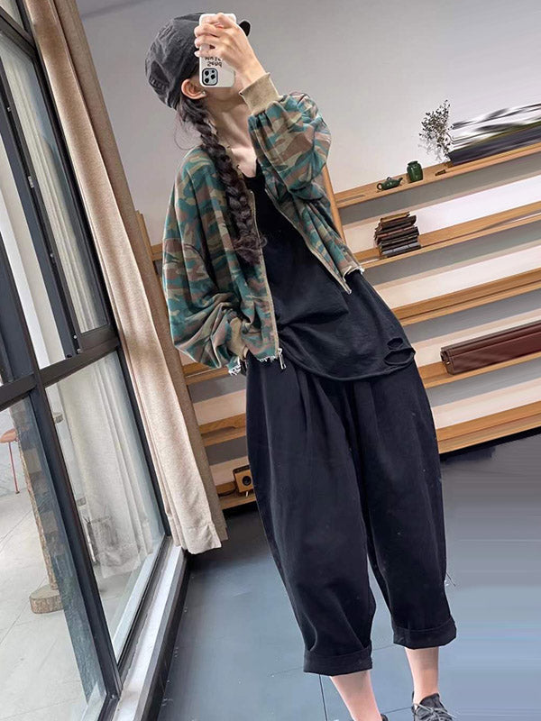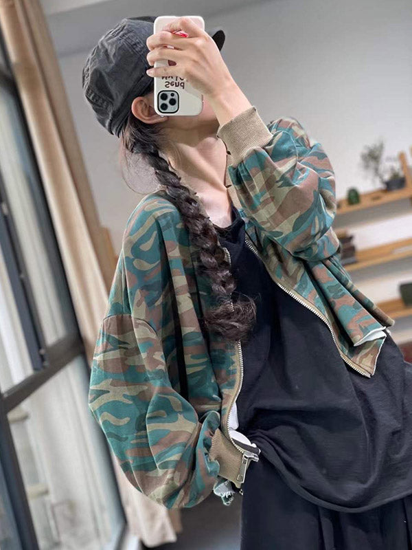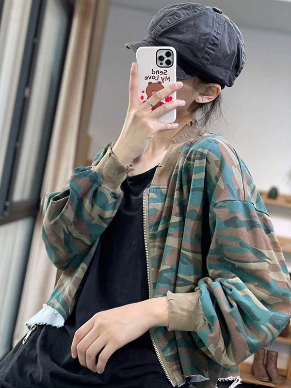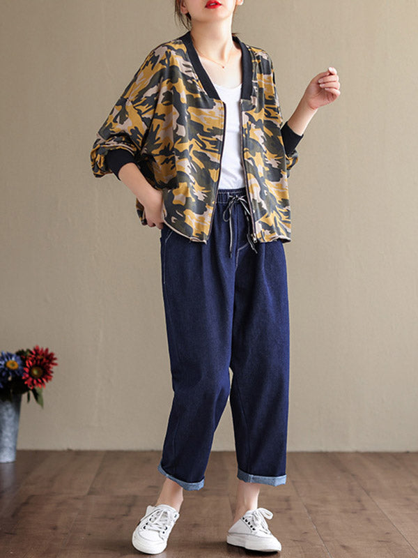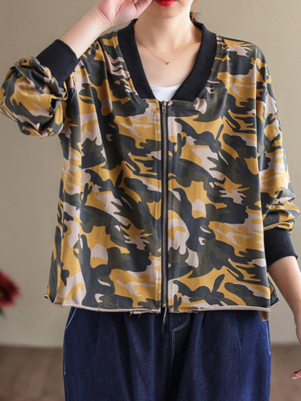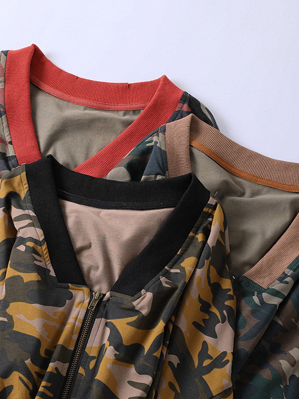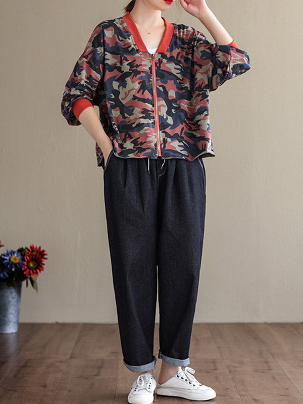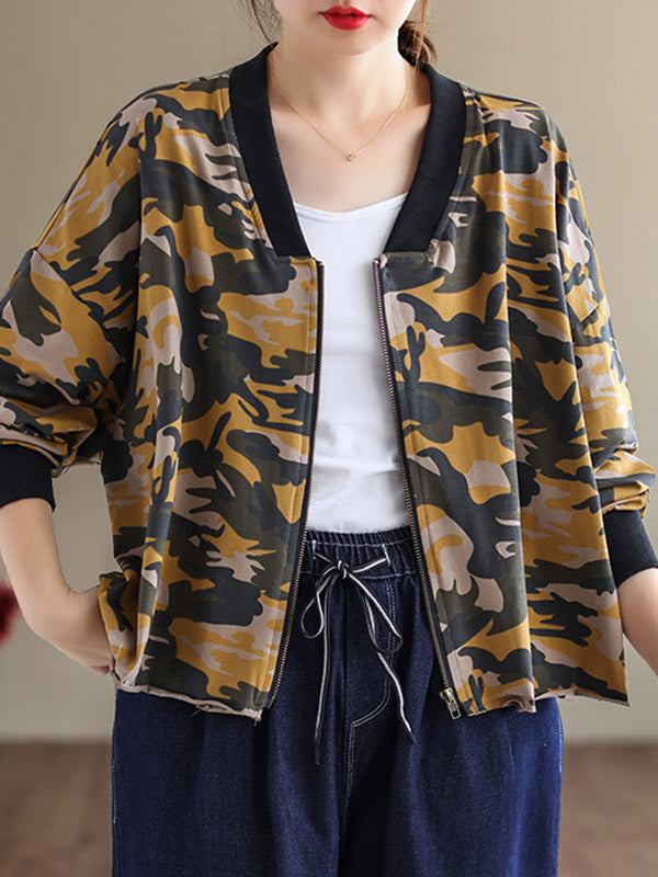 Casual Zipper V-Neck Camouflage Printed Long Sleeves Outerwear
