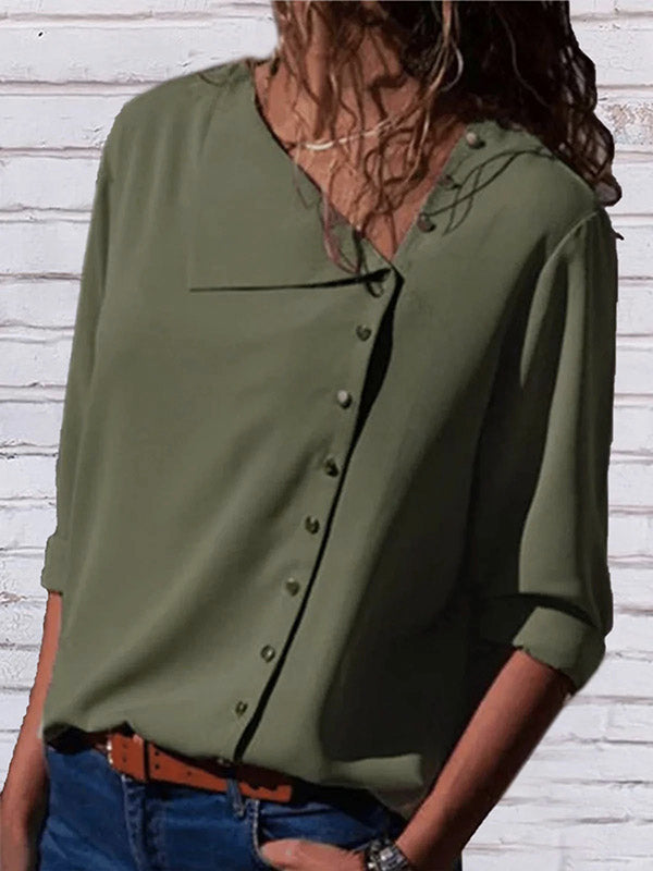 Causal Buttoned Asymmetric Long Sleeves V-Neck Blouse Tops