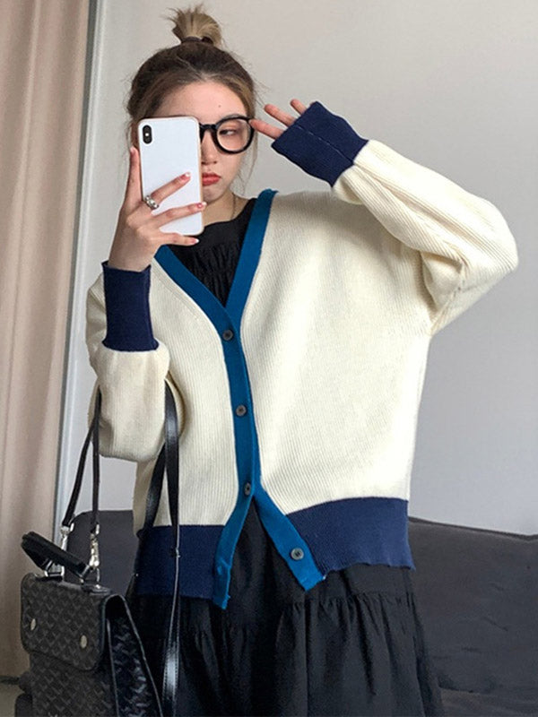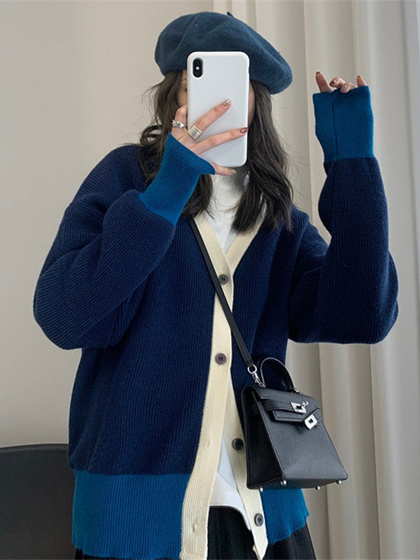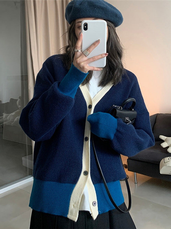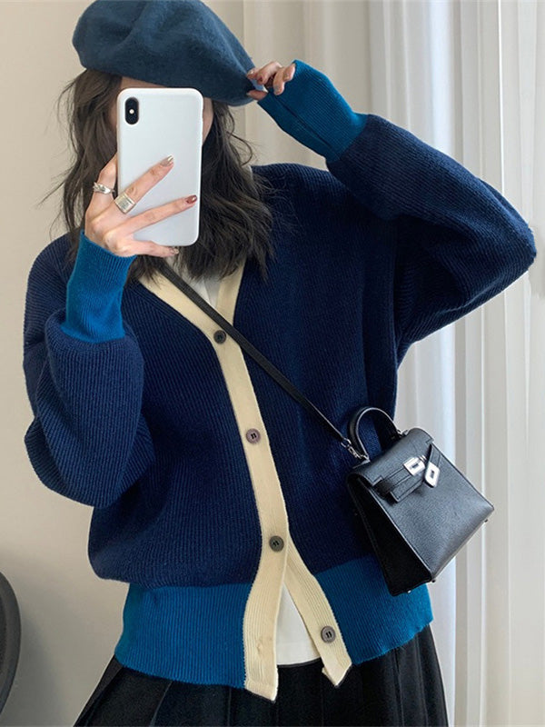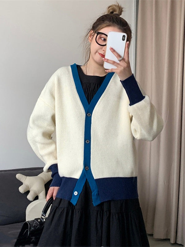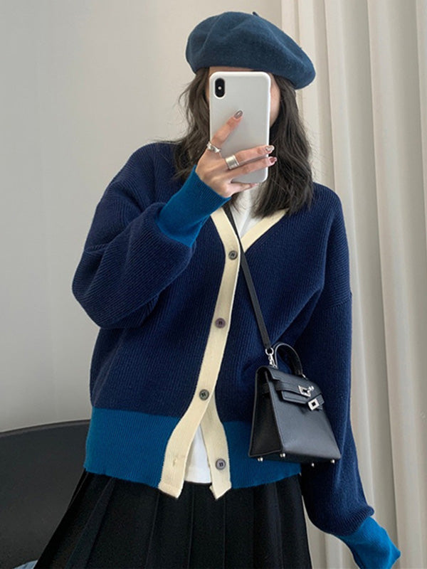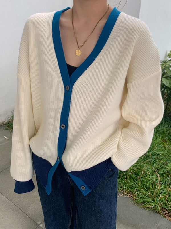 Causal Contrast Color Buttoned V-Neck Long Sleeves Cardigan Outwear