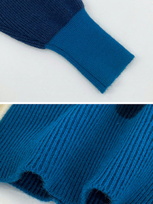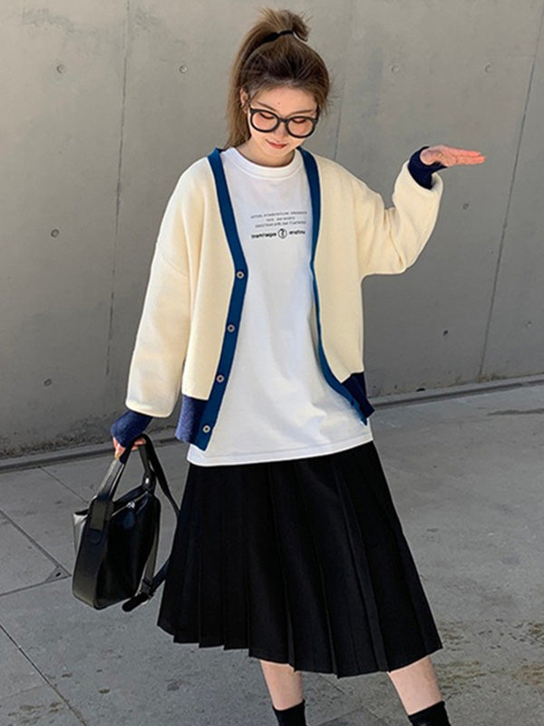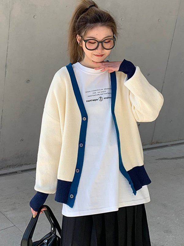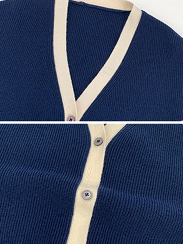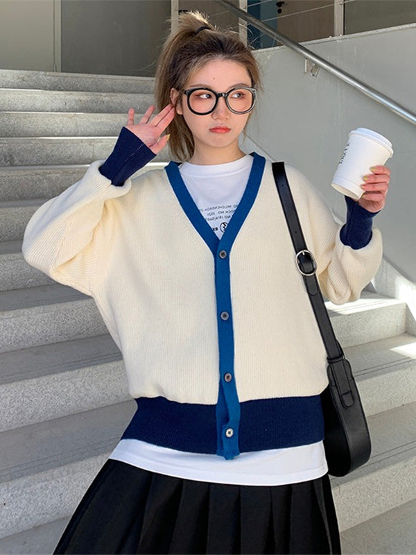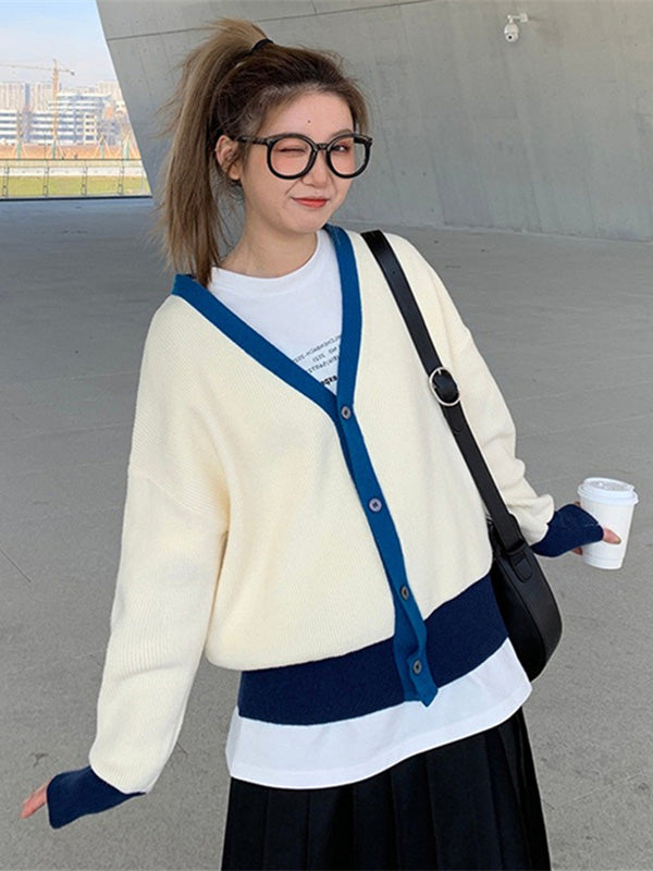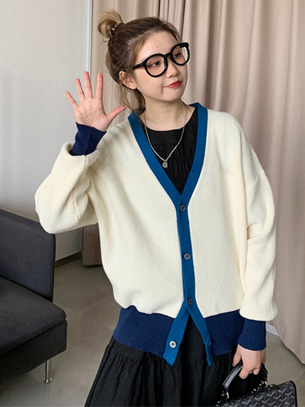 Causal Contrast Color Buttoned V-Neck Long Sleeves Cardigan Outwear
