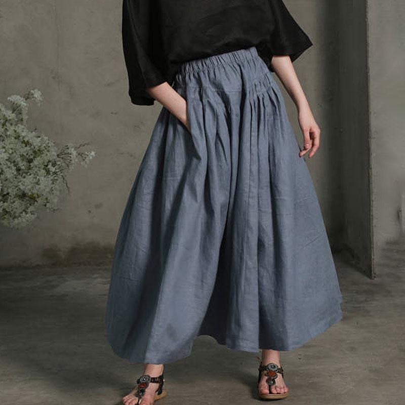 Causal Women Cotton Linen Loose Blue Pleated Skirt