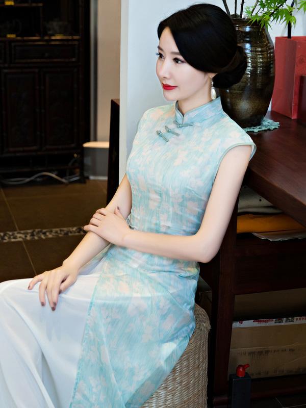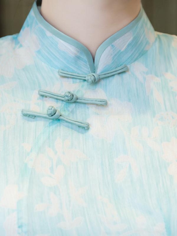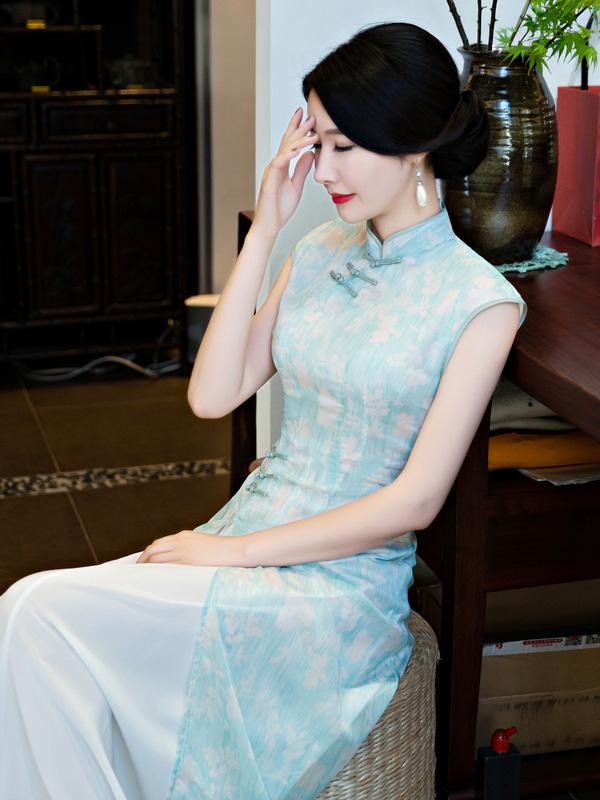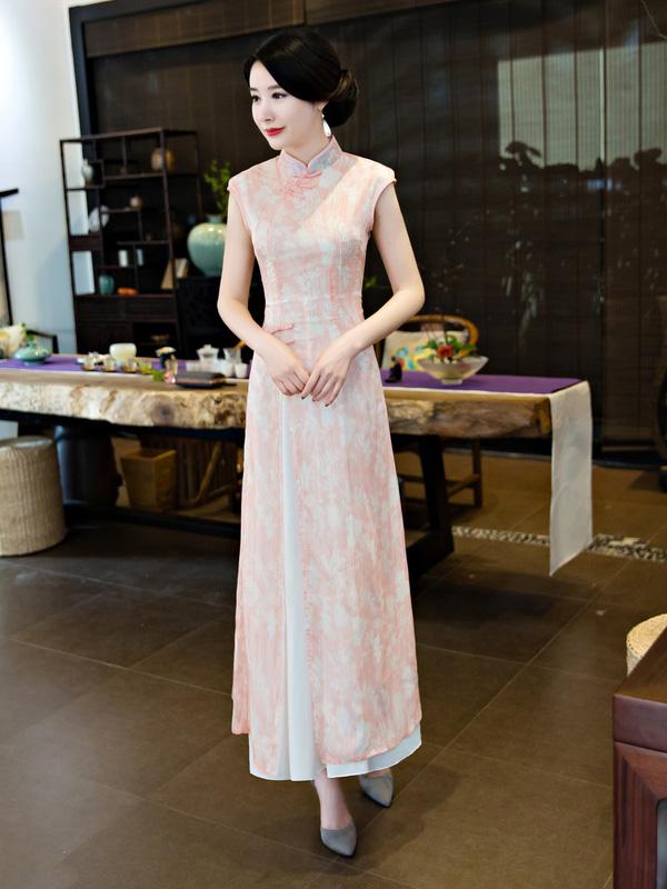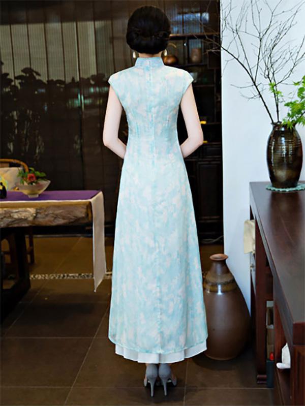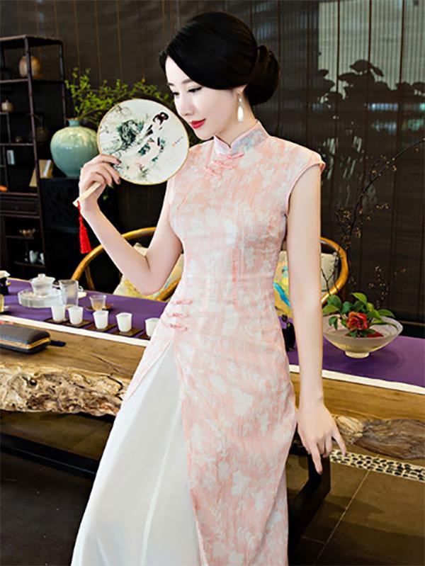 Chiffon Blue&Pink Split-side Ao Dai Cheongsam