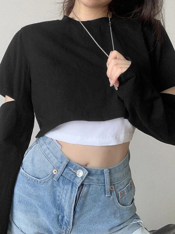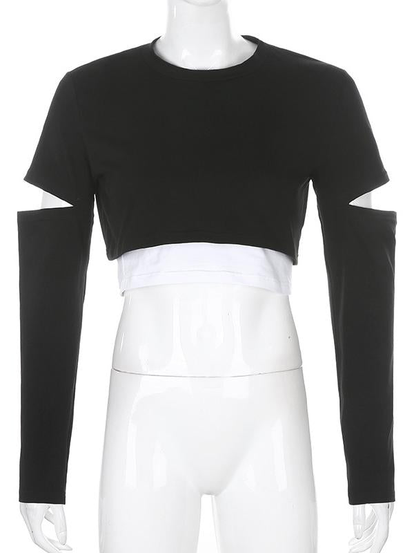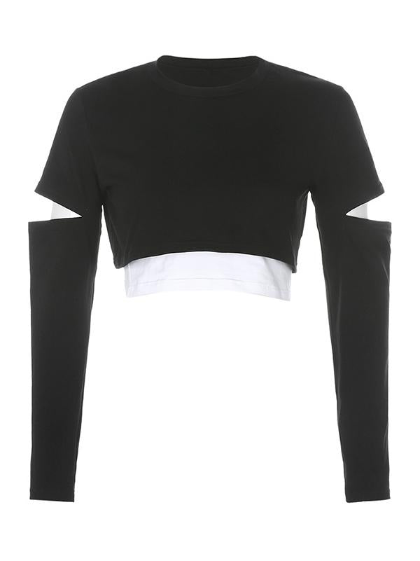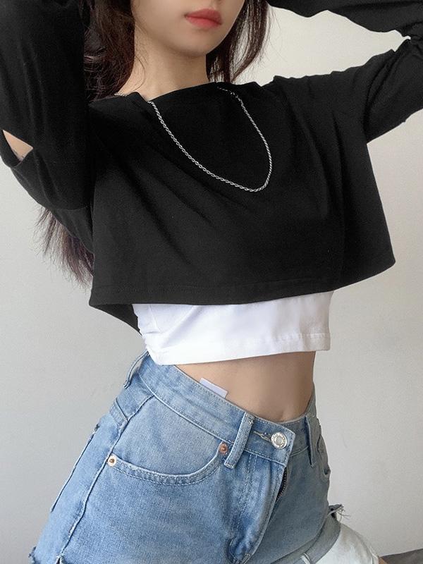 Contrast Color Long Sleeves Exposed Navel False Two Tees