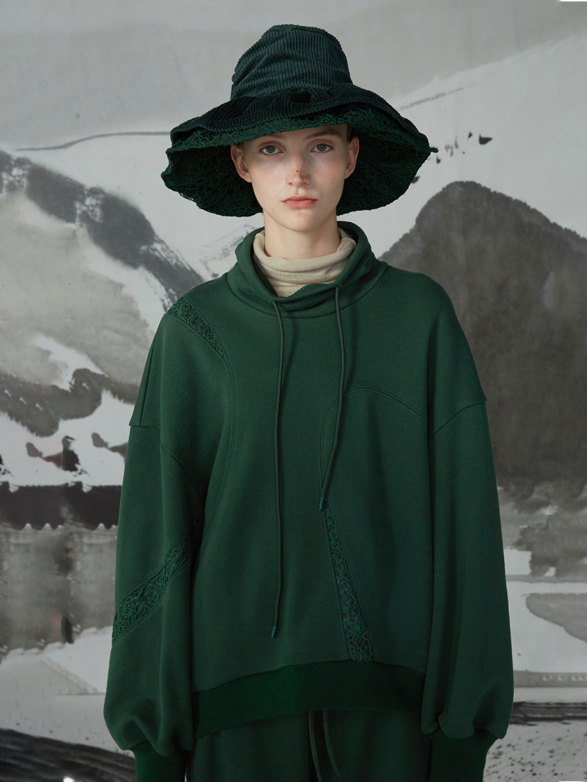 This set uses a dark-colored texture knit fabric to splicing high-grade lace fabric collisions, adding