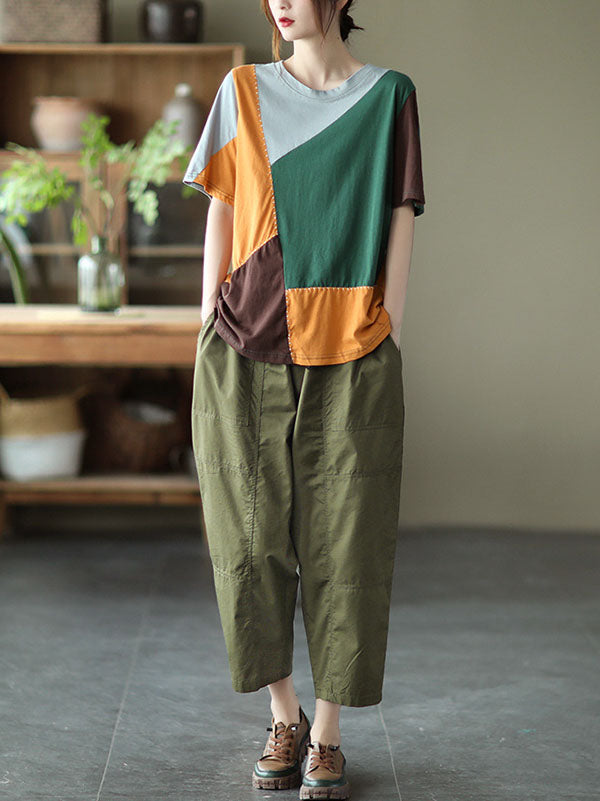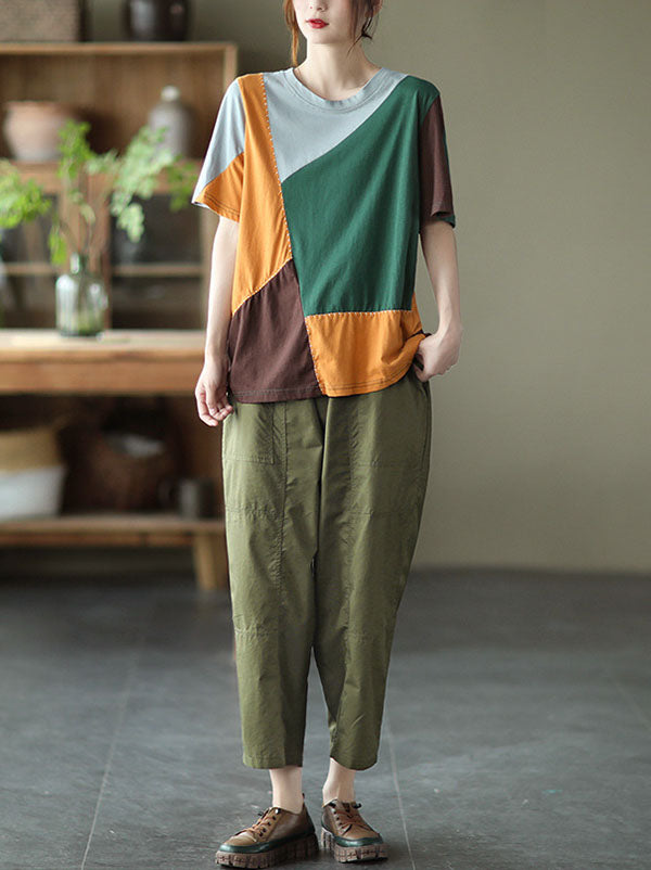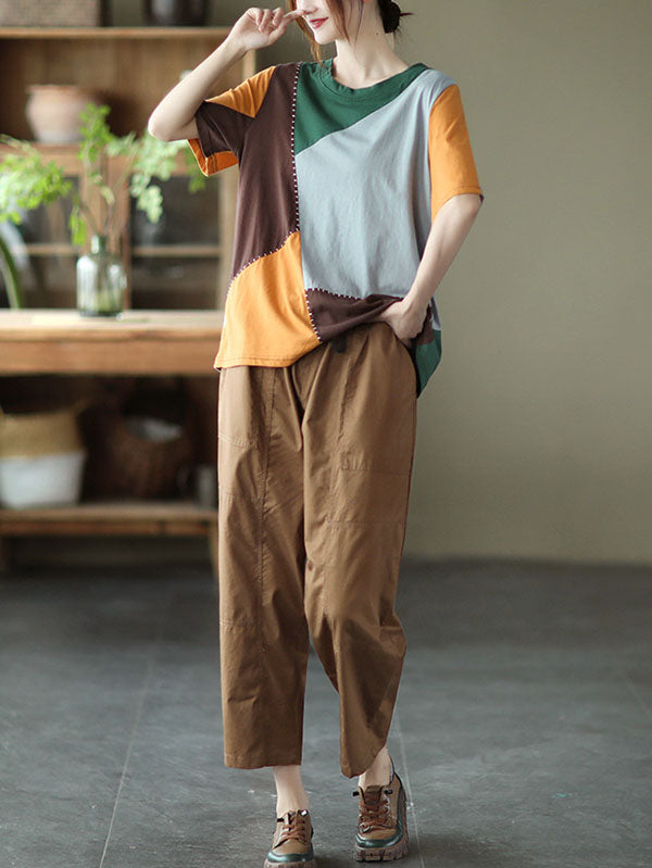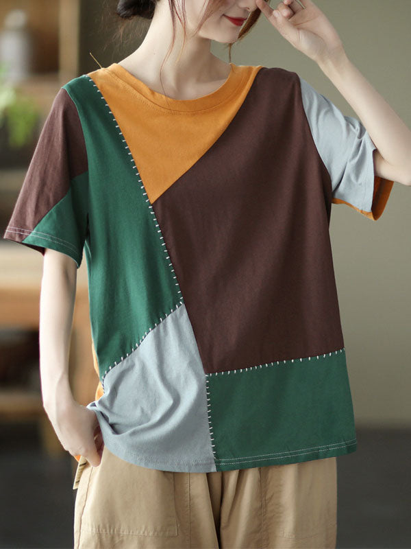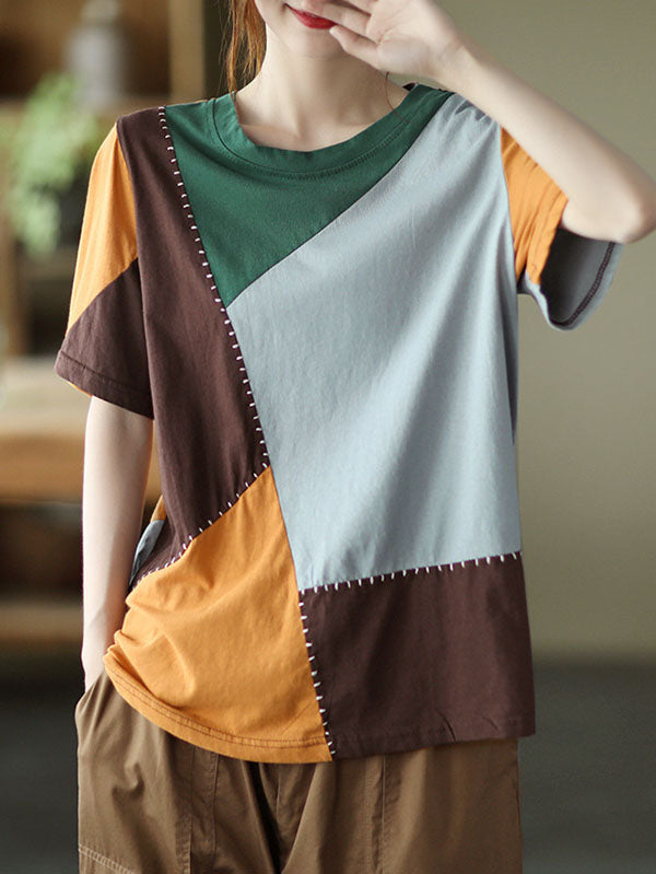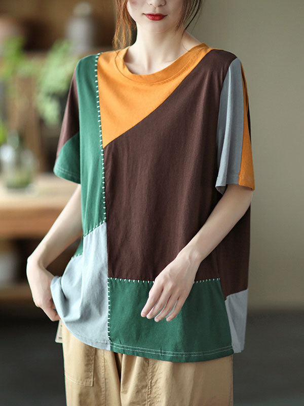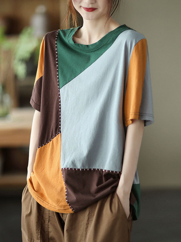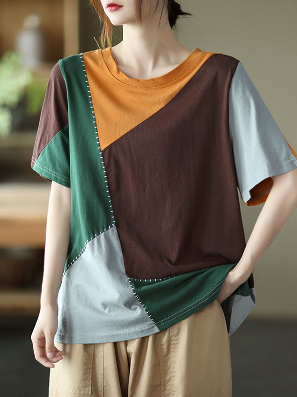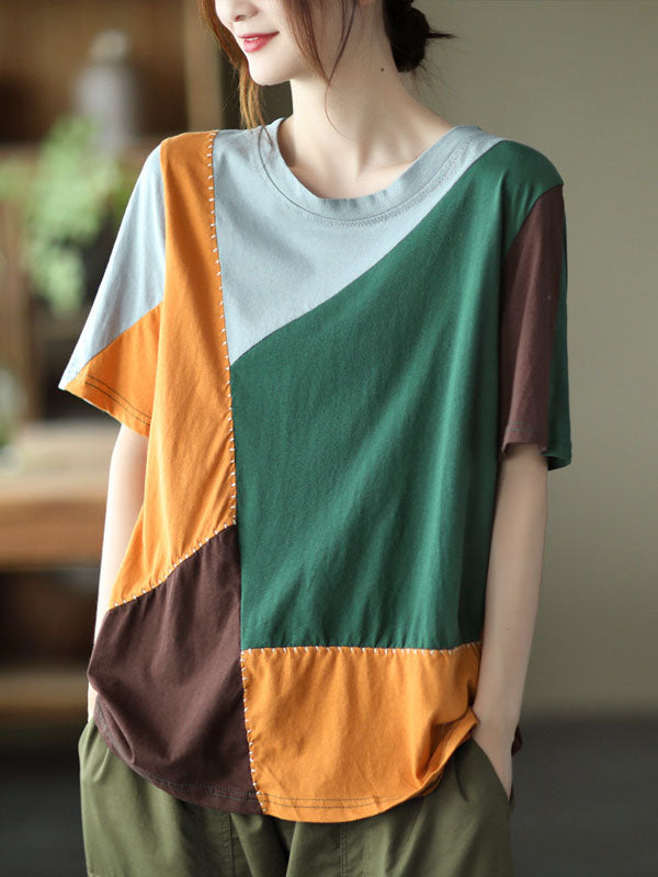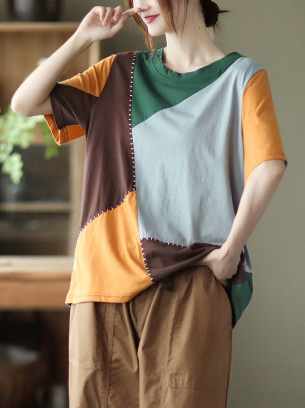 Cotton Blend Round-Neck Contrast Color T-Shirts Tops