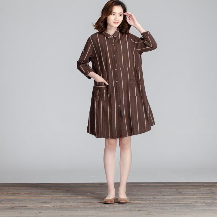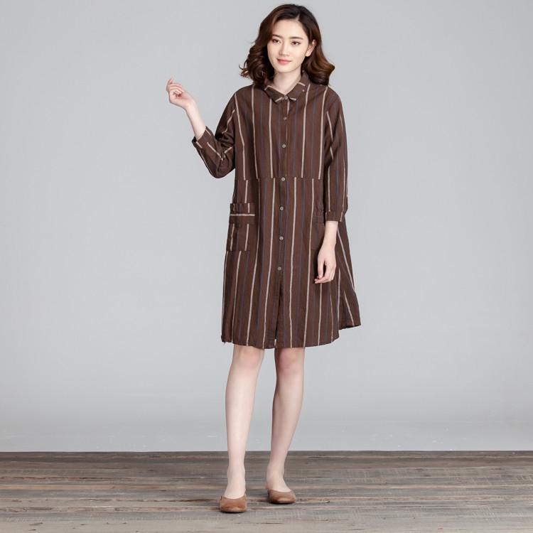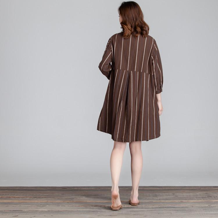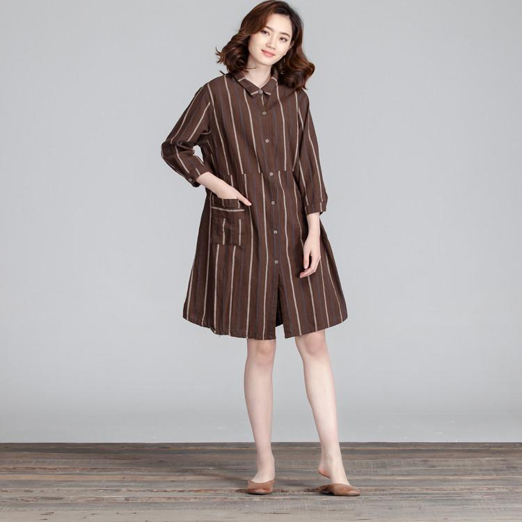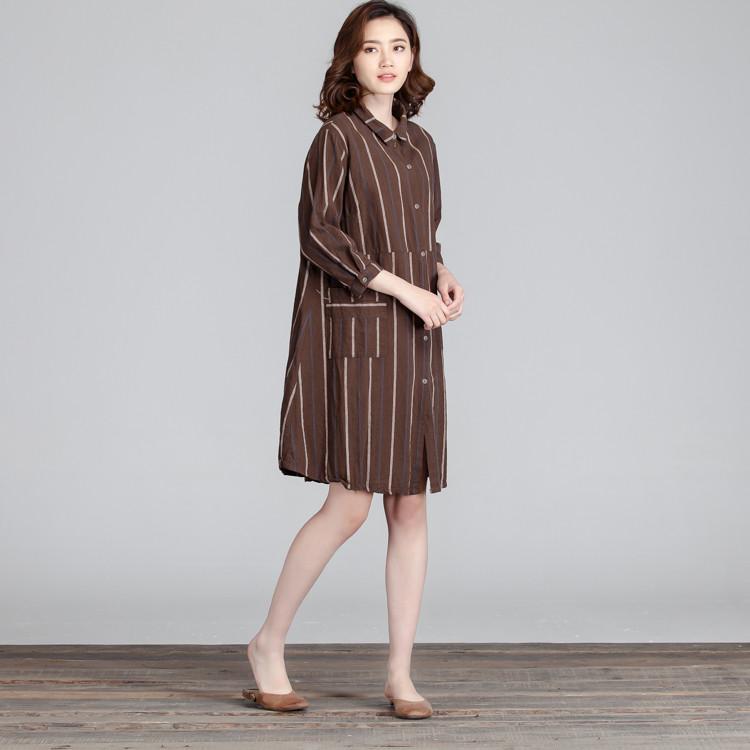 Cotton Women Splicing Casual Linen Loose Stripe Pocket Dress