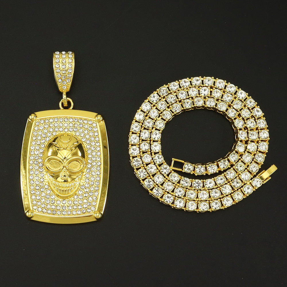 Cross-Border Three-Dimensional Skull Diamond Pendant Necklace Hip Hop Rapper Wear Single Row Diamond Tennis Chain Clavicle Chain