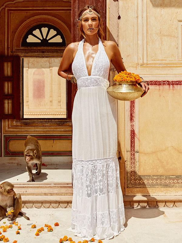 Deep V-neck Backless Lacy Split-joint Maxi Dress