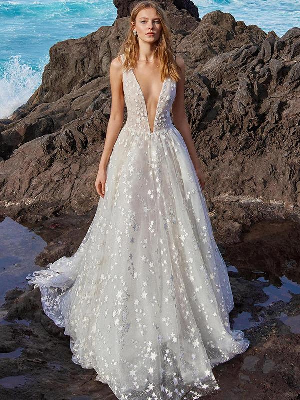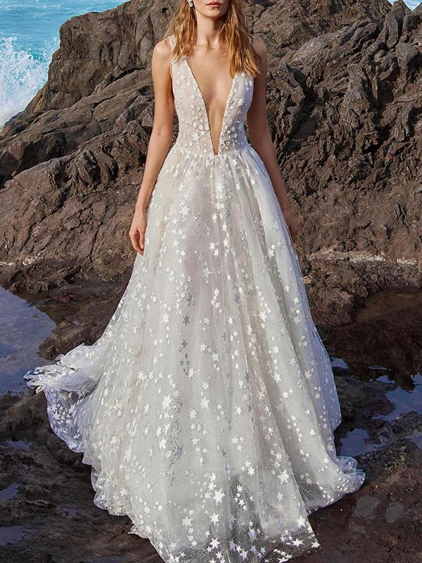 Deep V-neck Sleeveless V-back Bohemia Wedding Dress