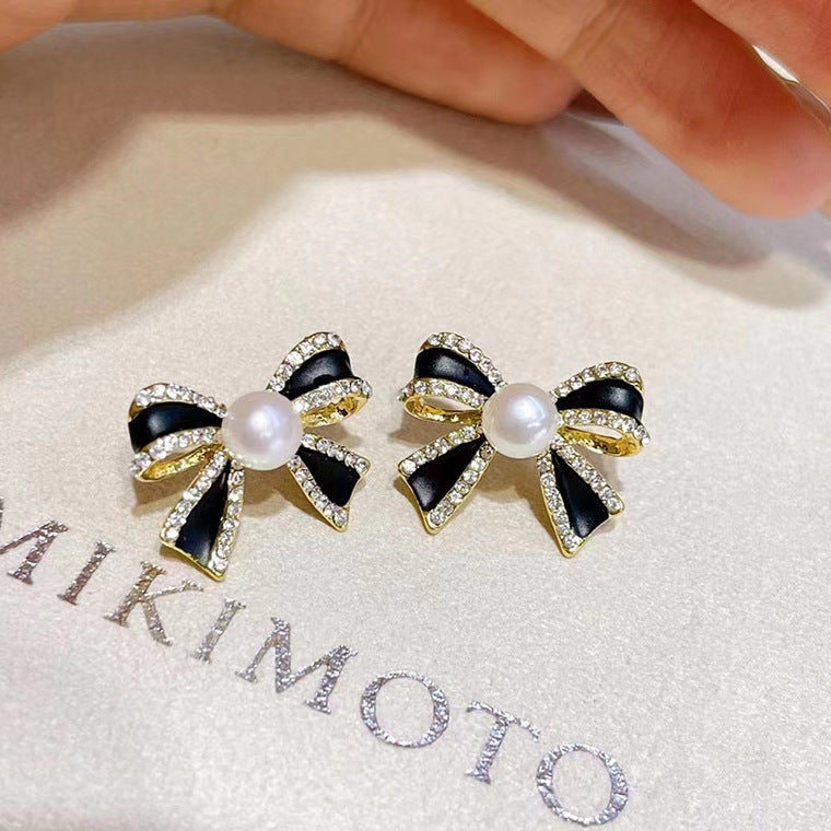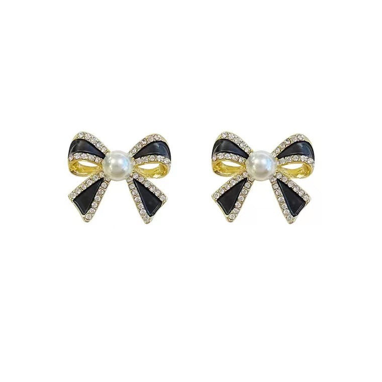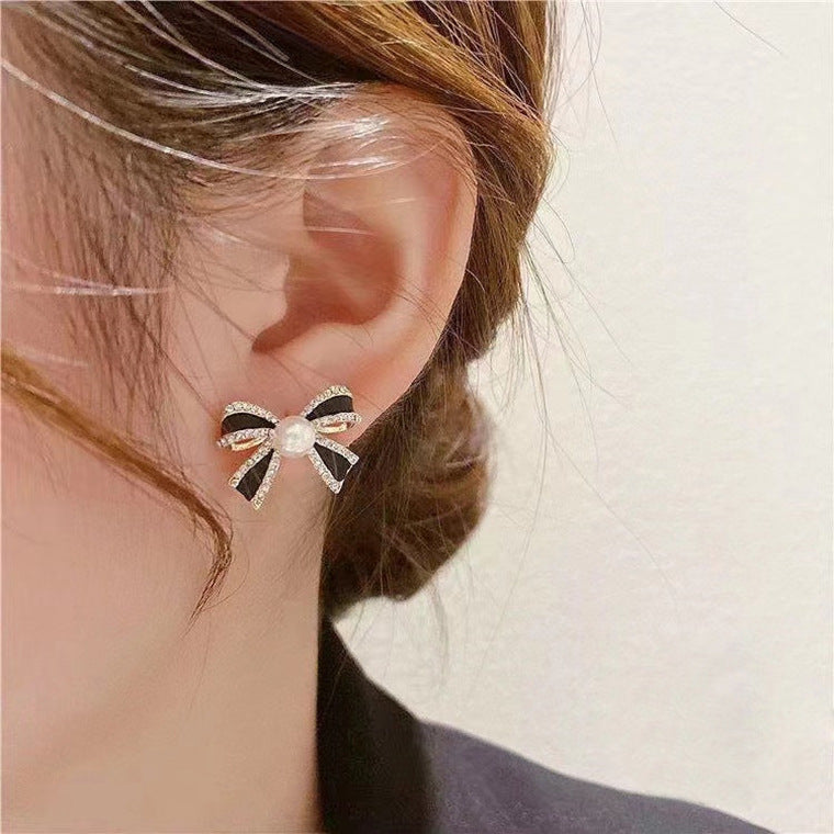 Delicate and small pearl black bow earrings