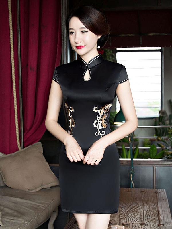 Elegant Black Embroidered Short Cheongsam