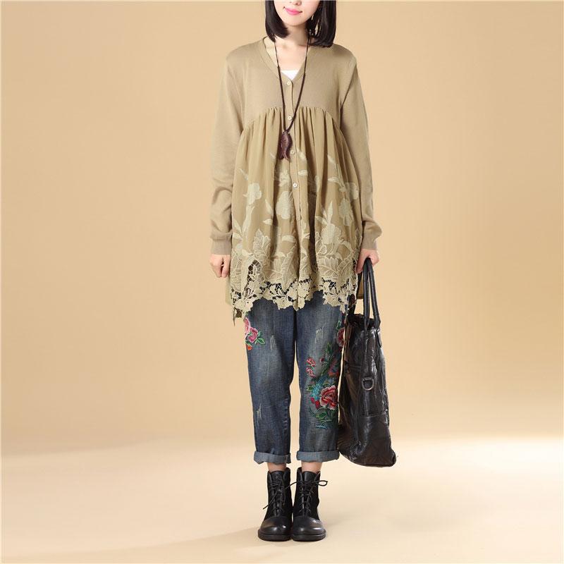 Women Embroidered Long Sleeve Khaki Pleated Sweater Dress