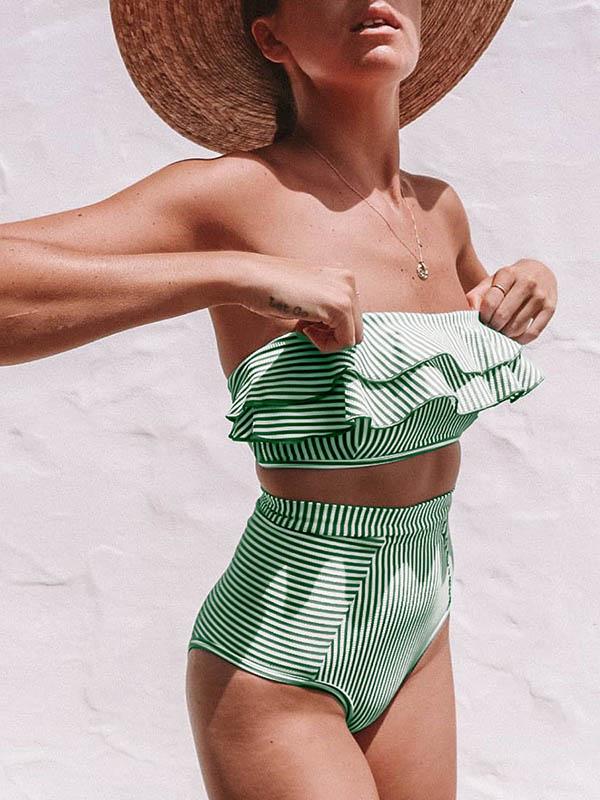 Falbala Tiered Striped Bandeau Split Bikini Swimsuit