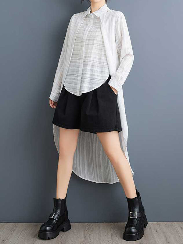 False Two High-Low Buttoned Split-Joint Striped Lapel Blouses&Shirts Tops