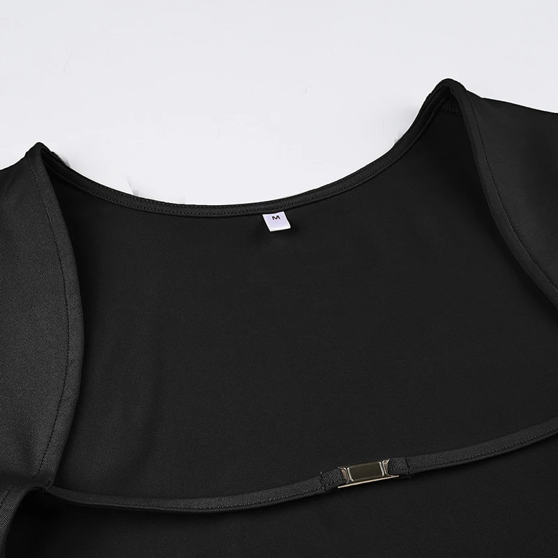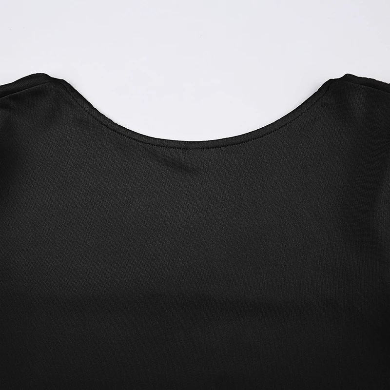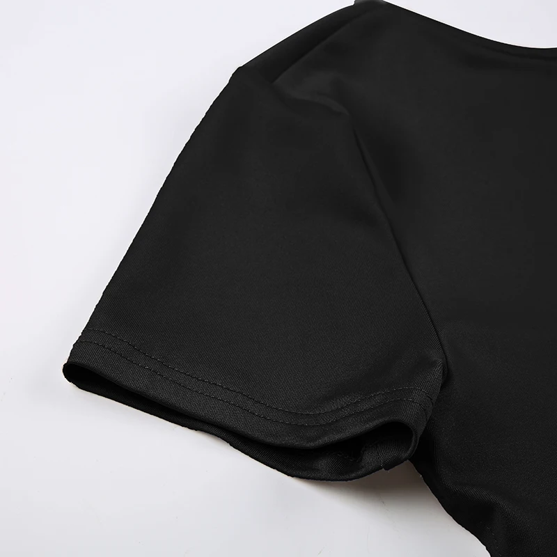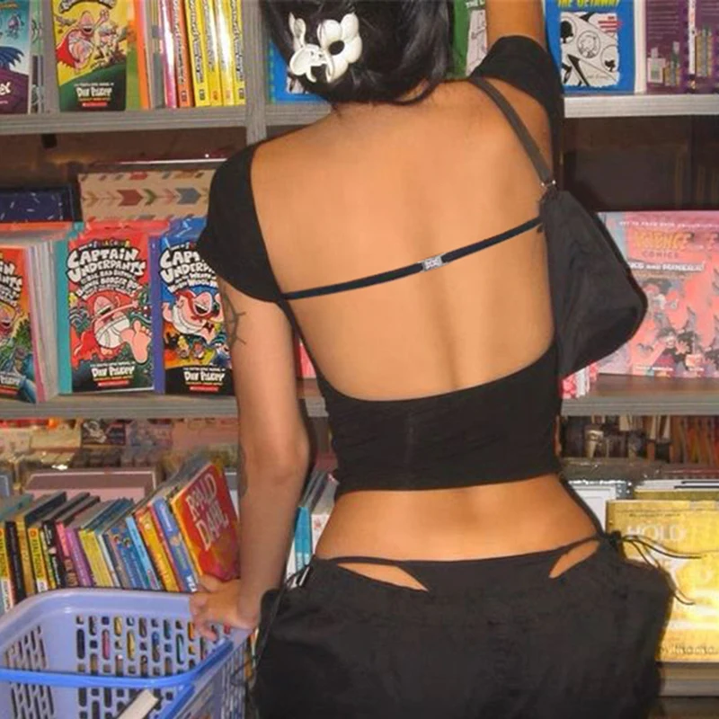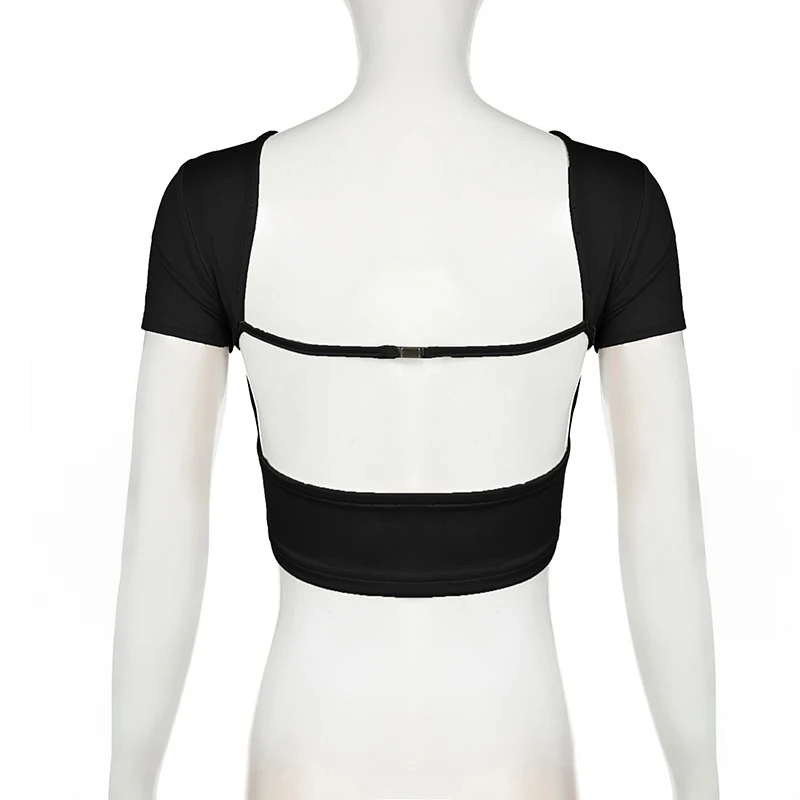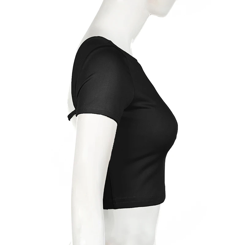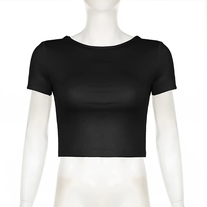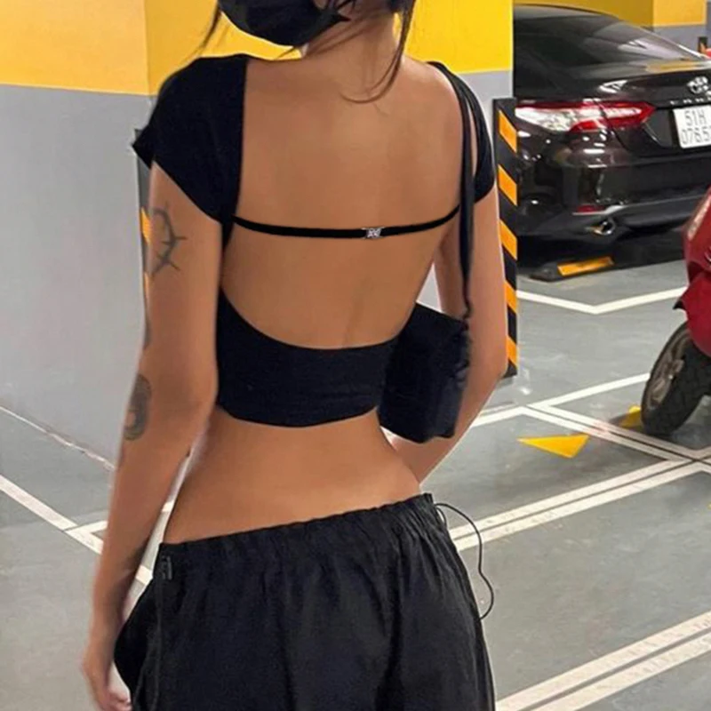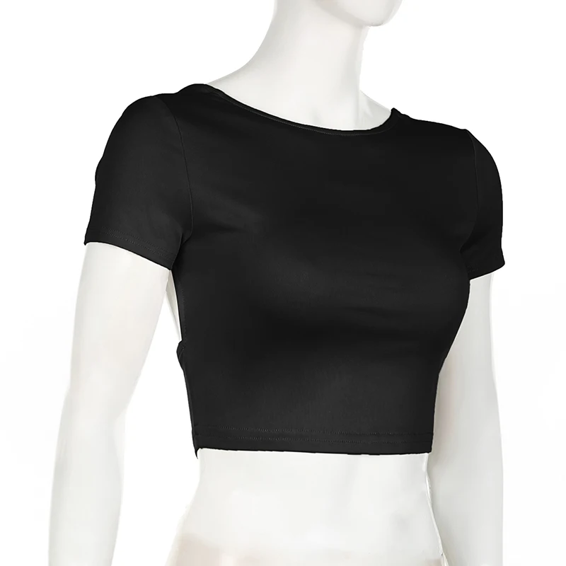 fashion Backless Short Sleeves Crop Tops Crewneck Solid Black 90s Slim Outfits Streetwear Sexy Slim Casual Women's Cloth