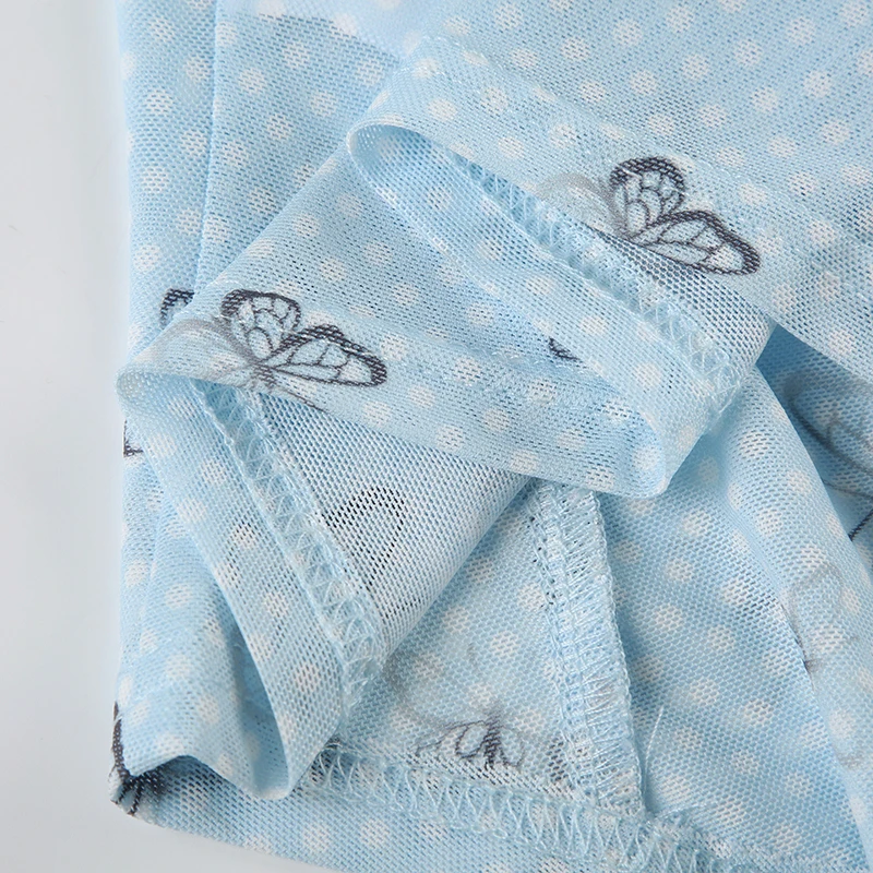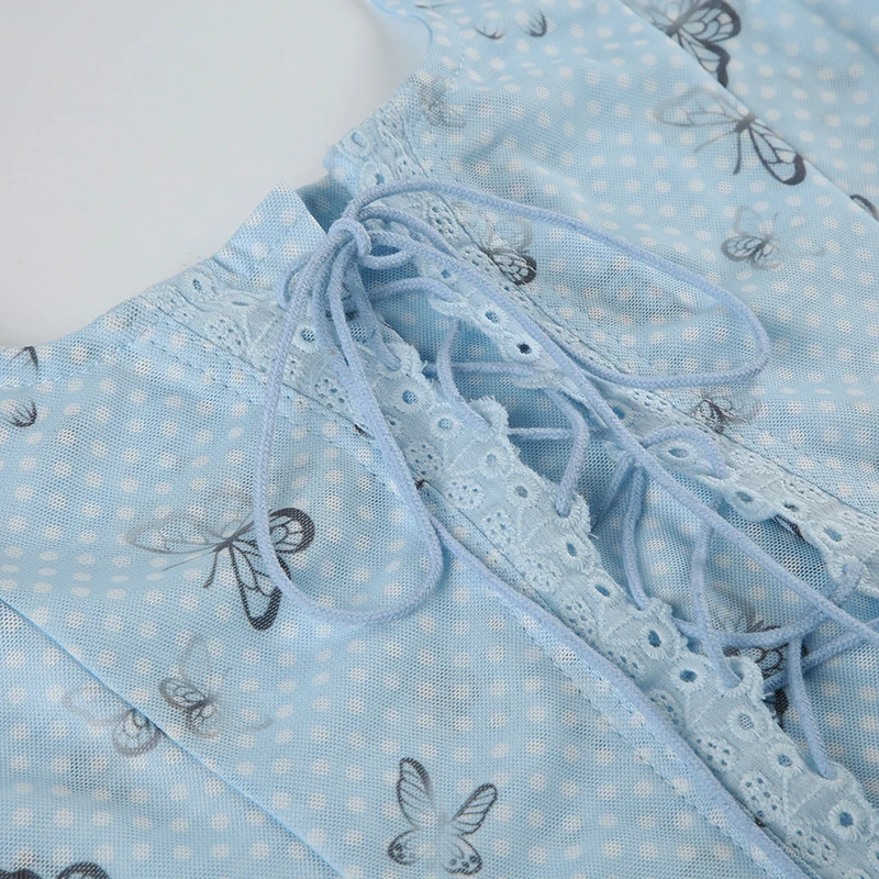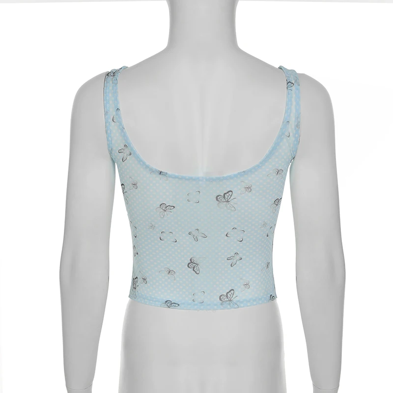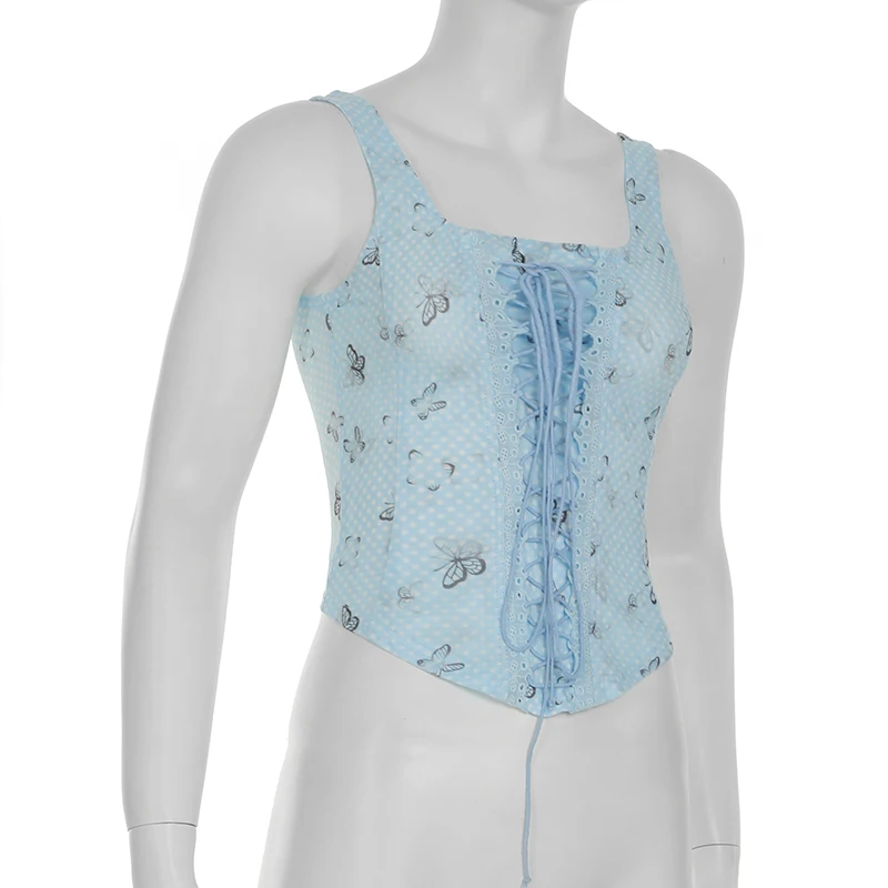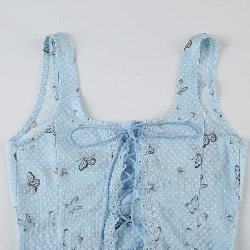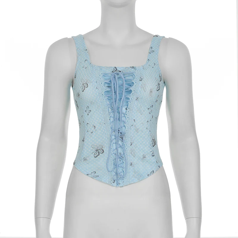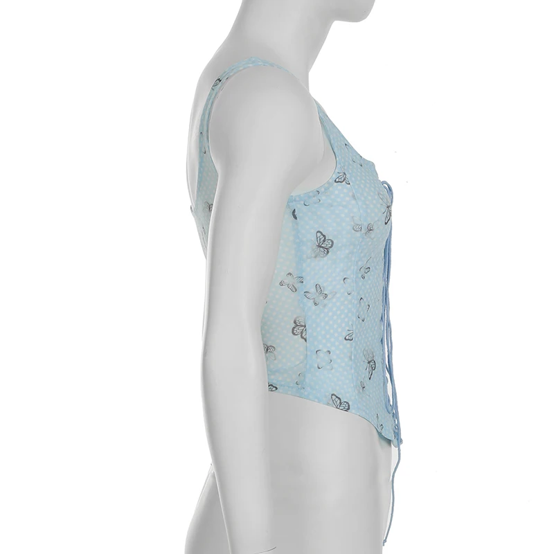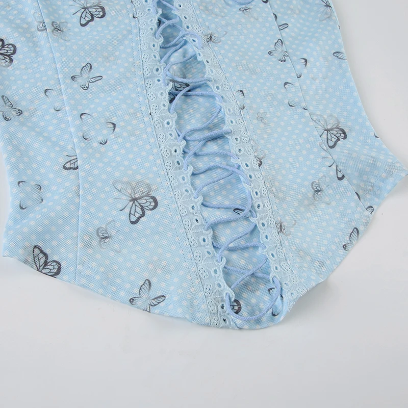 fashion Blue Bandage Butterfly Print Camisole Vintage Streetwear Slim Backless Elastic Top Summer Hottie Aesthetic Bustier