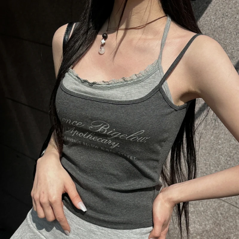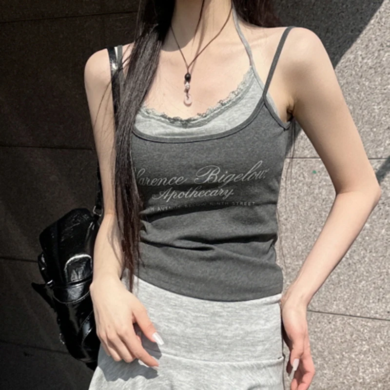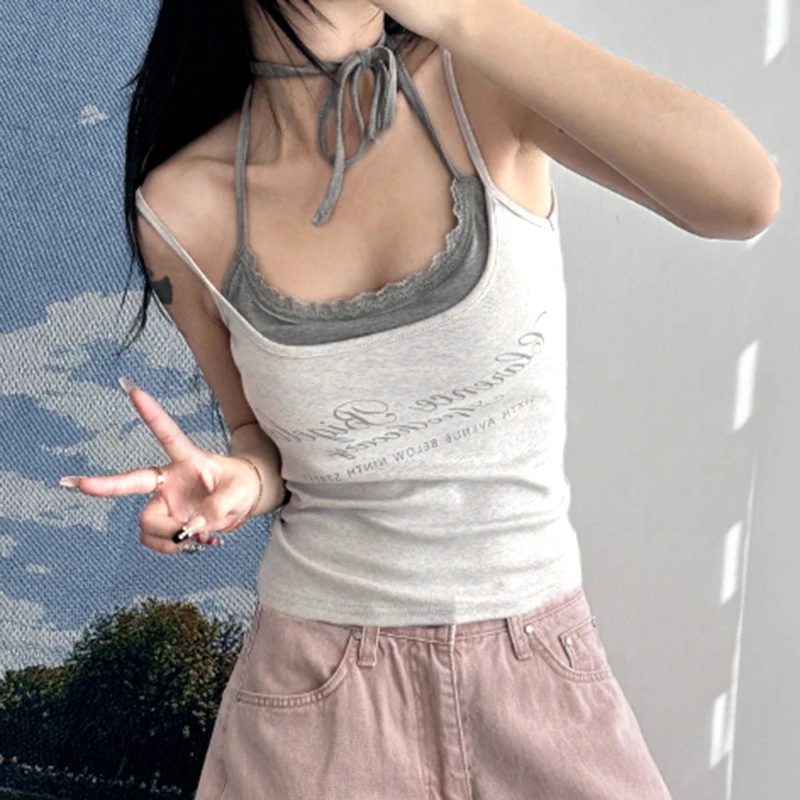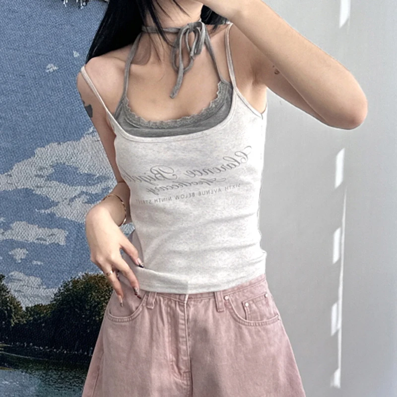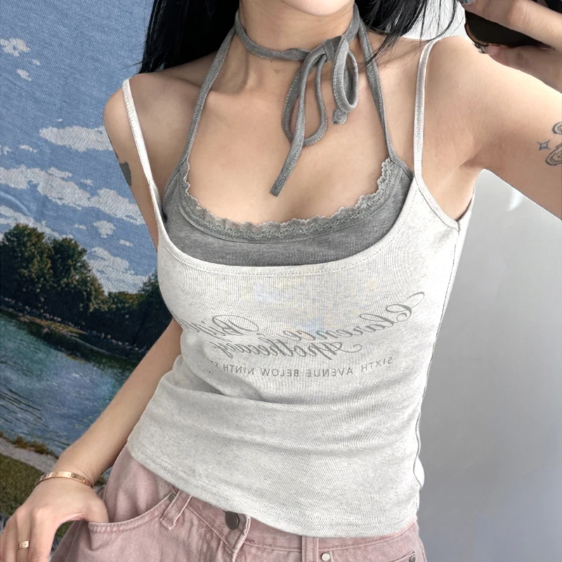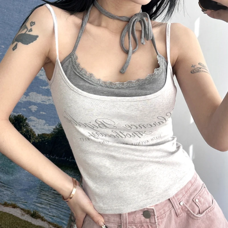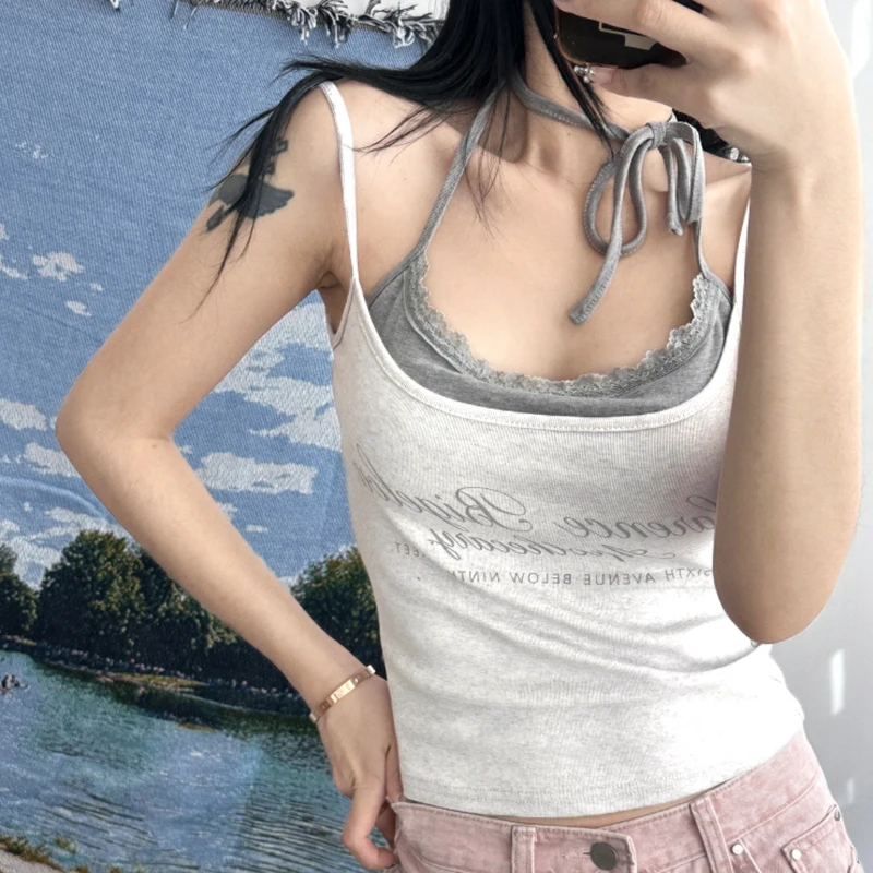 fashion Fake Two Pieces Color Contrast Camisole Backless Letter Print Slim Sexy Casual Slim Crop Top Basic Sweet Clothings