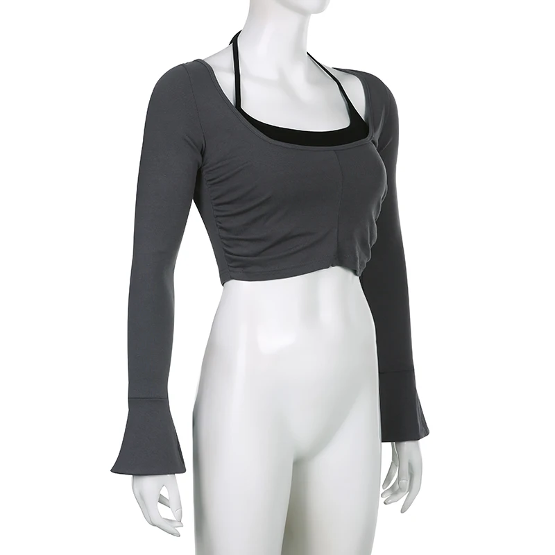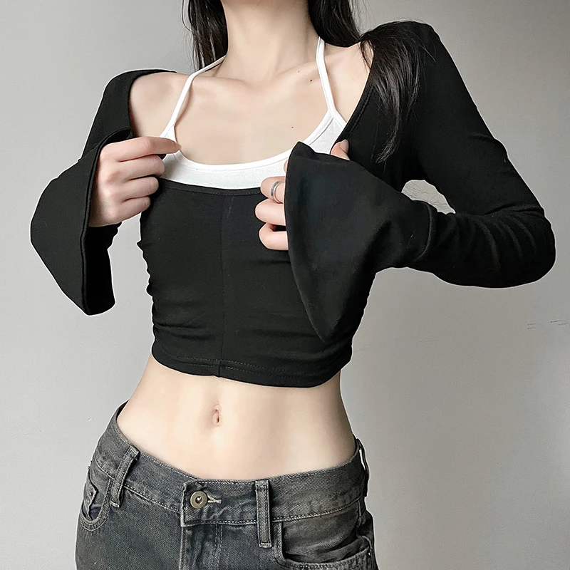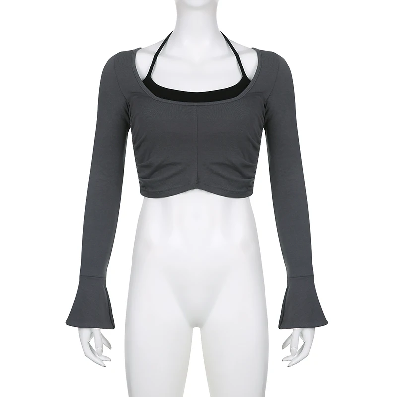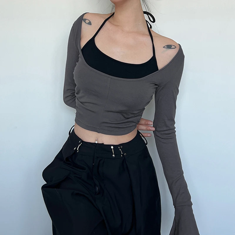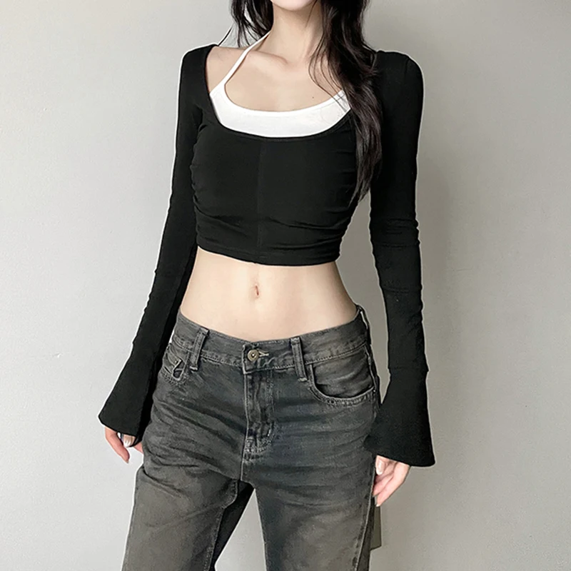 fashion Flare Sleeve Color Contrast Two-piece Top Set Halter Crop Casual Streetwear 90s Vinatge Suit Hottie Basic Twinset
