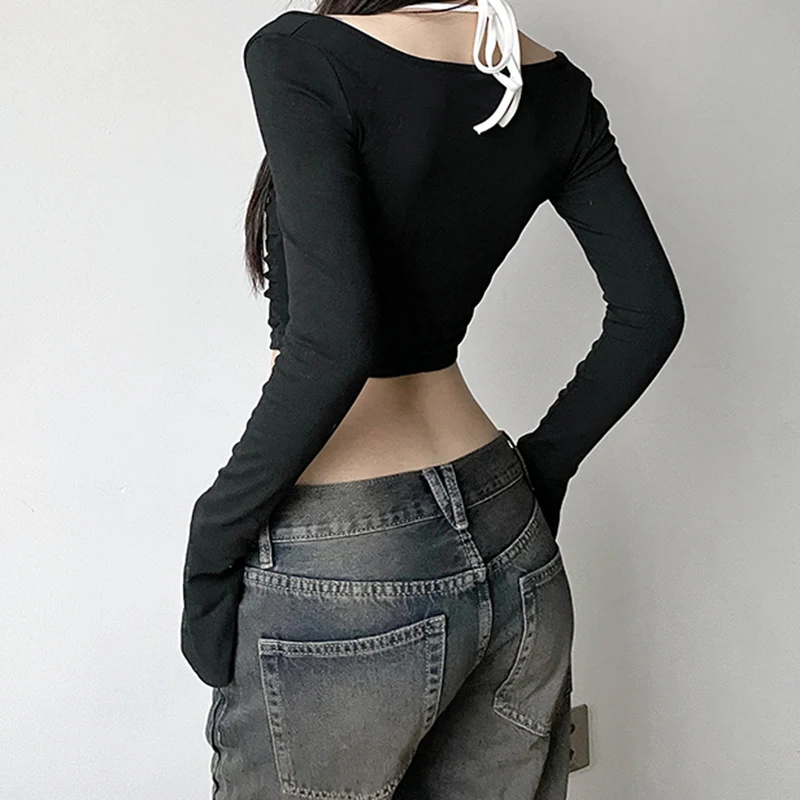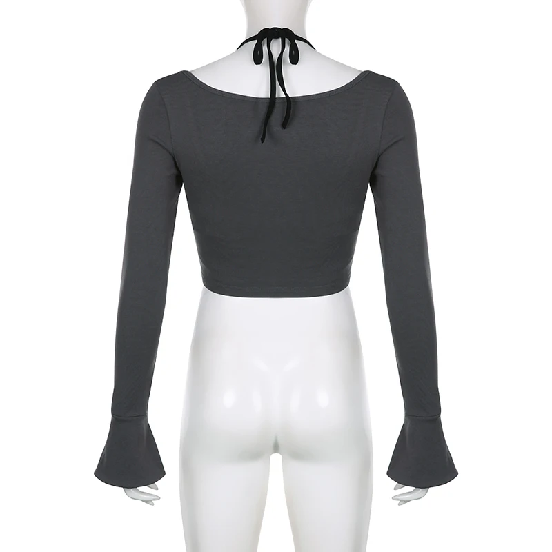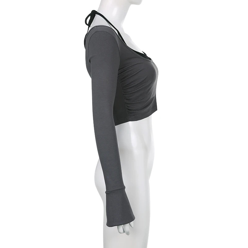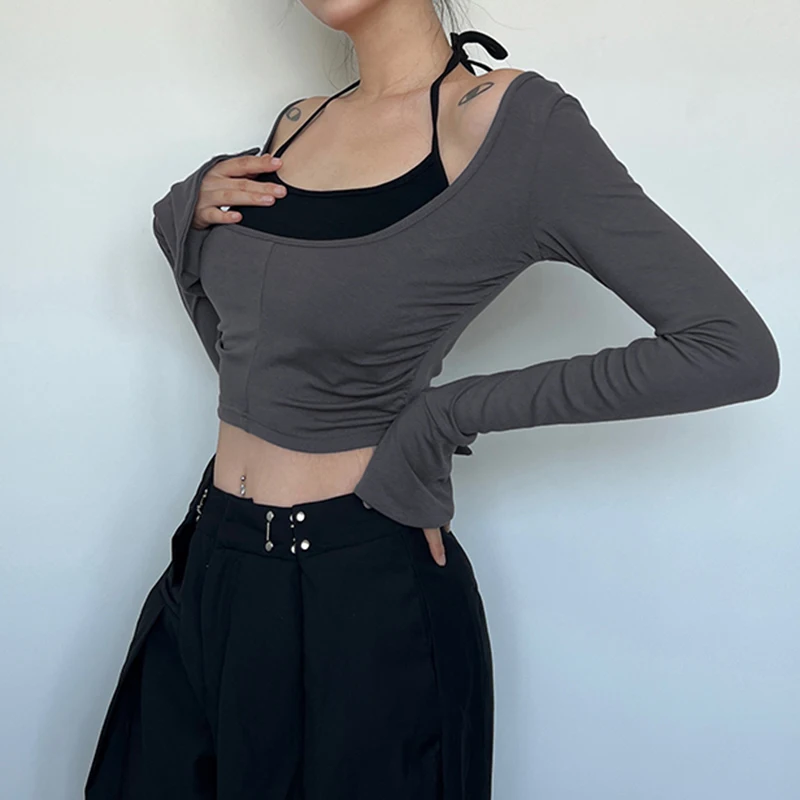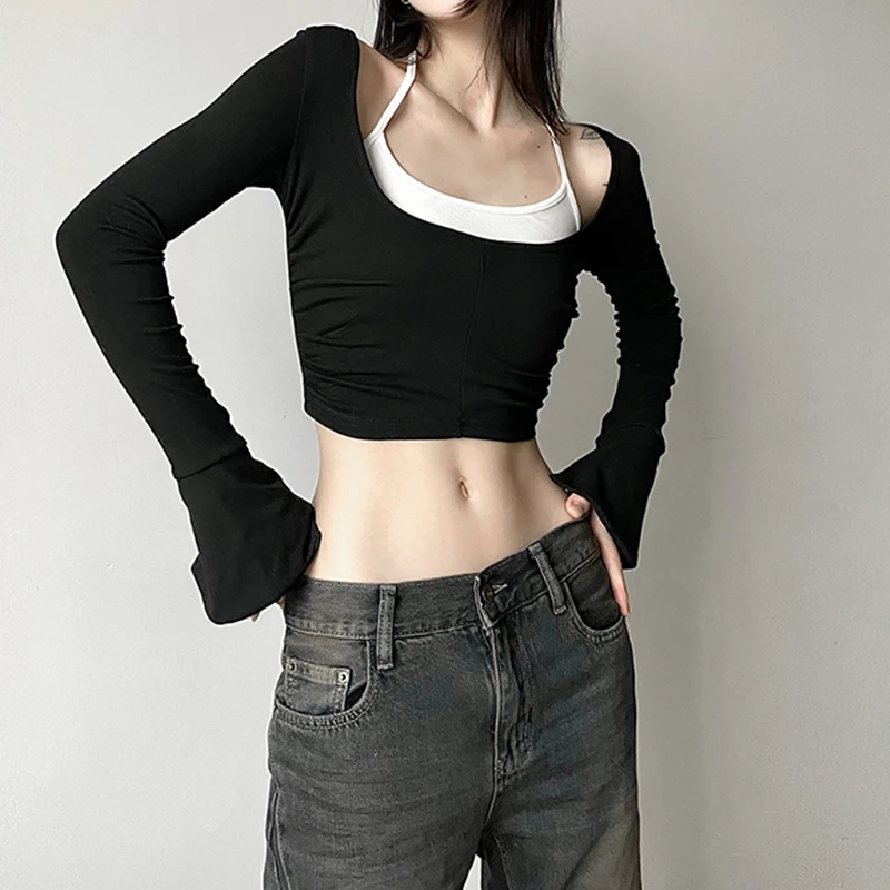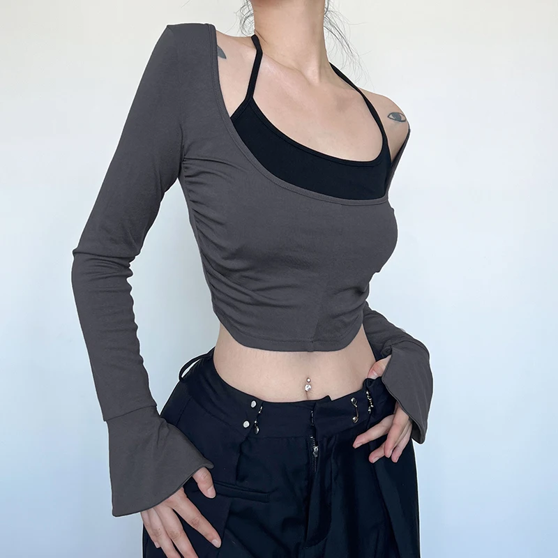fashion Flare Sleeve Color Contrast Two-piece Top Set Halter Crop Casual Streetwear 90s Vinatge Suit Hottie Basic Twinset