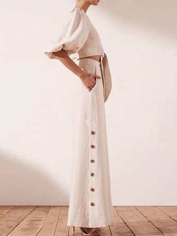 Fashion Lantern Sleeve Belted Tops&High Waist Wide Leg Pants Suits