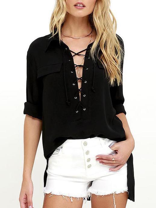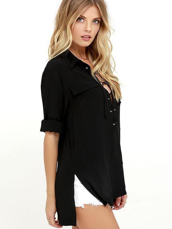 Fashion Long Sleeve Stand Neck Lace Up Blouse Tops