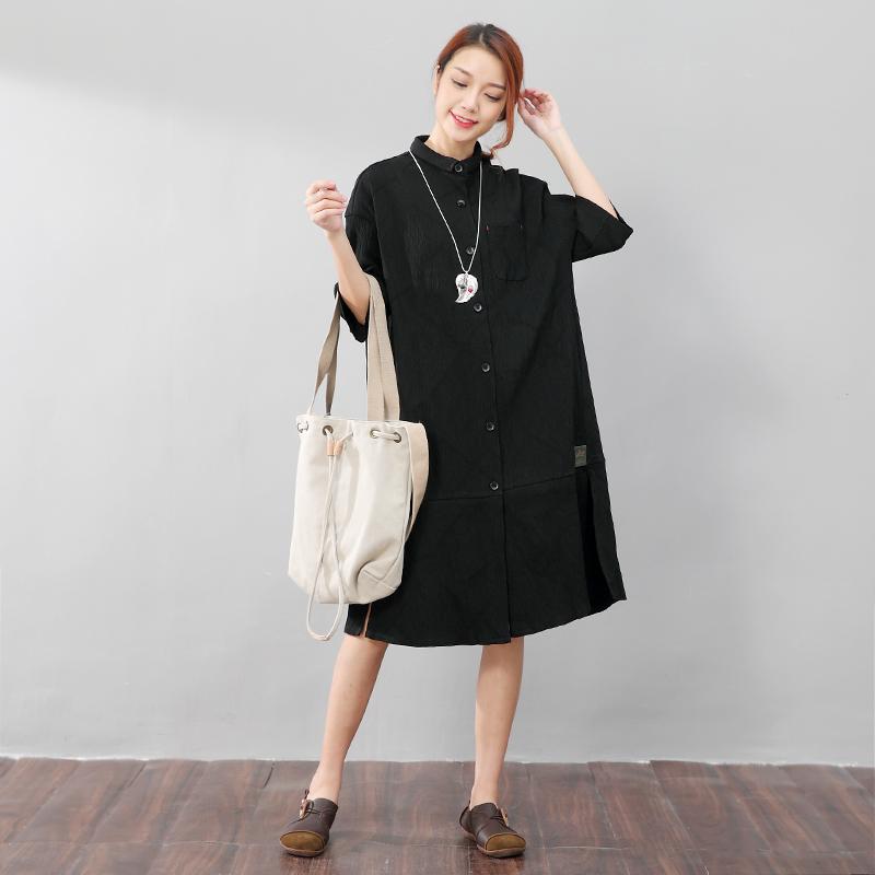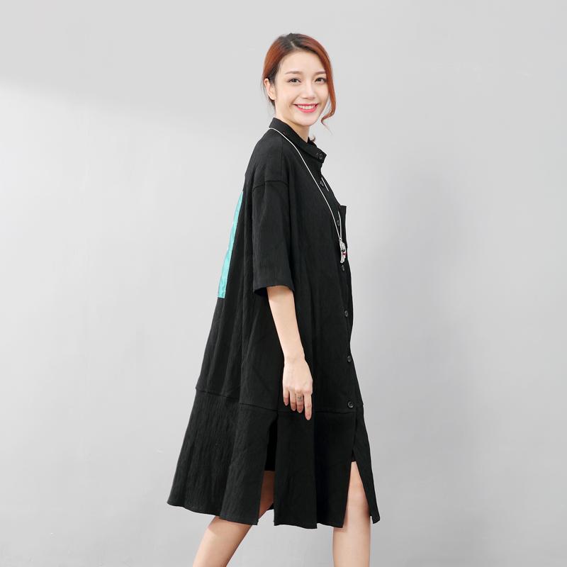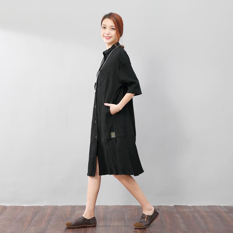 Fashion Polo Collar Single Breasted Back Splicing Women Black Dress