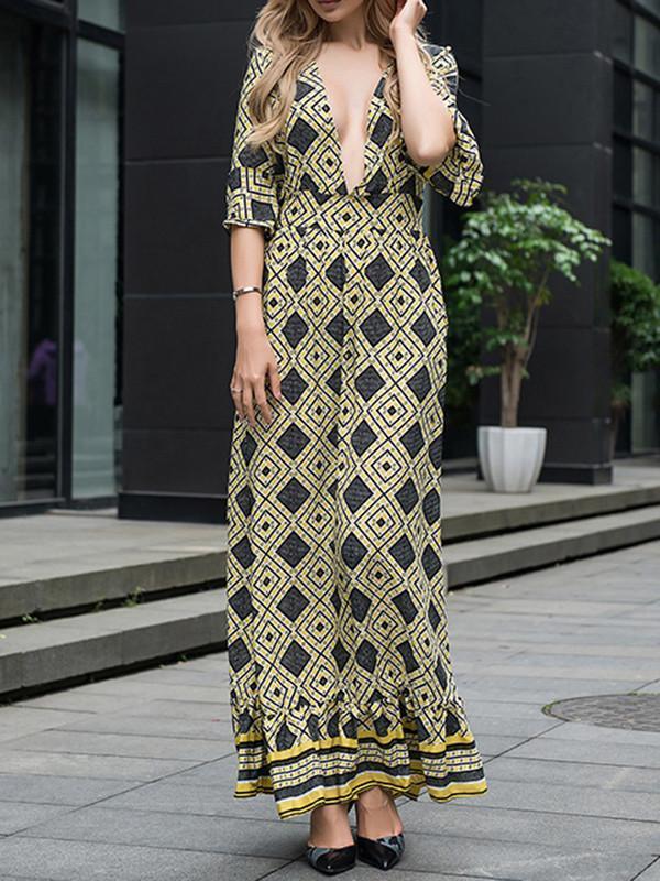 Fashion Popular Floral-Print Falbala Short Sleeve Deep V Neck Maxi Long Dress