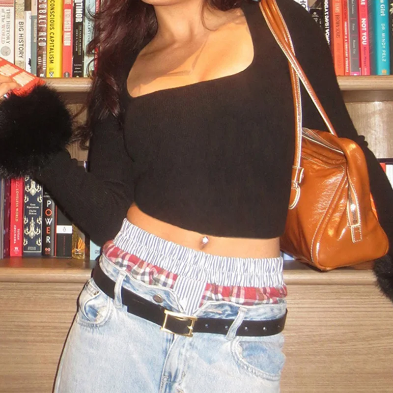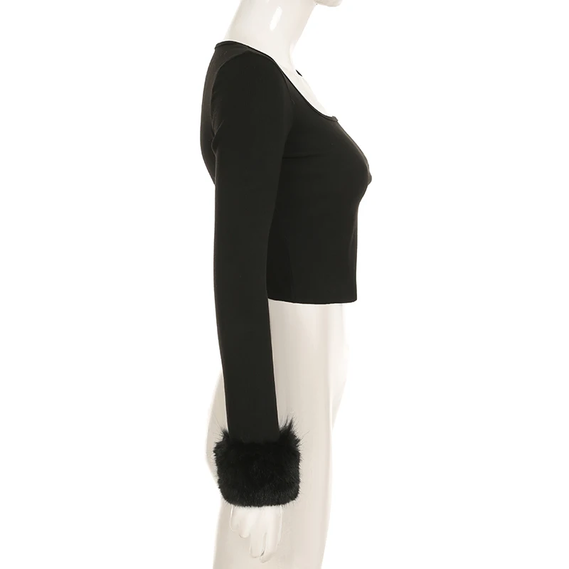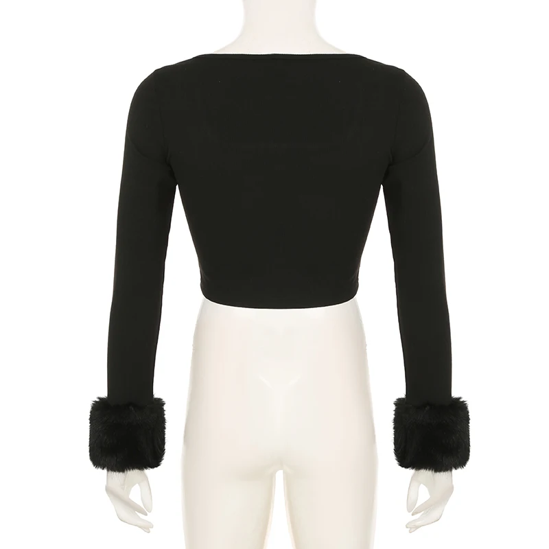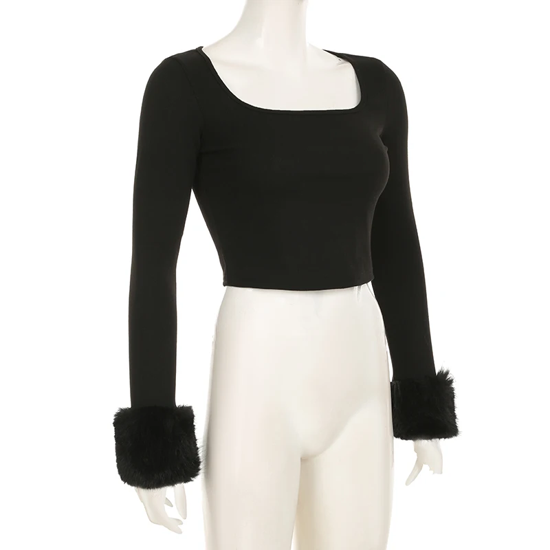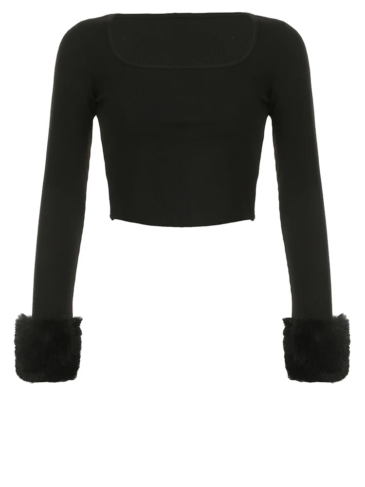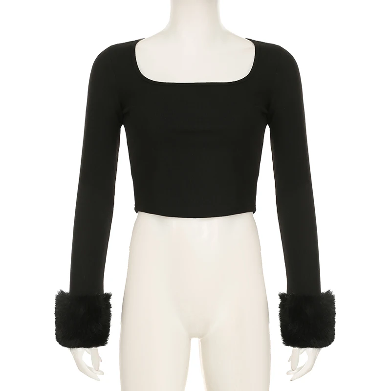 fashion Square Collar Y2K Tee Shirts Chic Casual Crop Tops Vintage Streetwear Long Sleeves Fur Cuff Slim Kintted Clothes