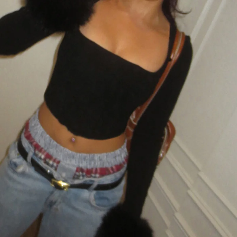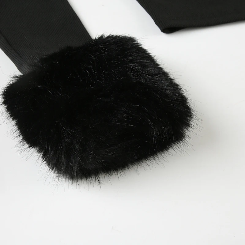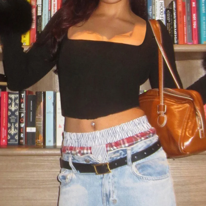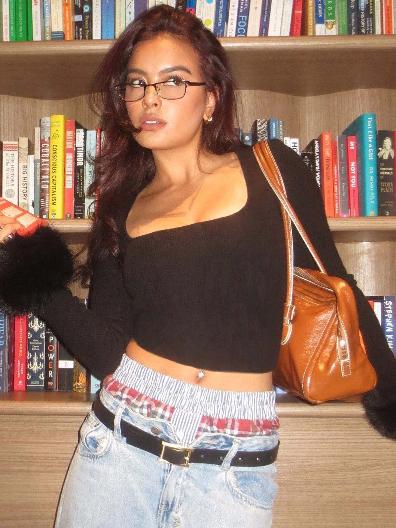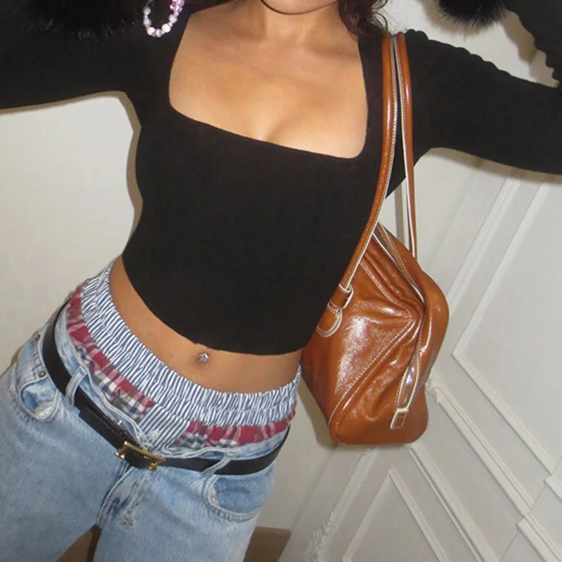 fashion Square Collar Y2K Tee Shirts Chic Casual Crop Tops Vintage Streetwear Long Sleeves Fur Cuff Slim Kintted Clothes